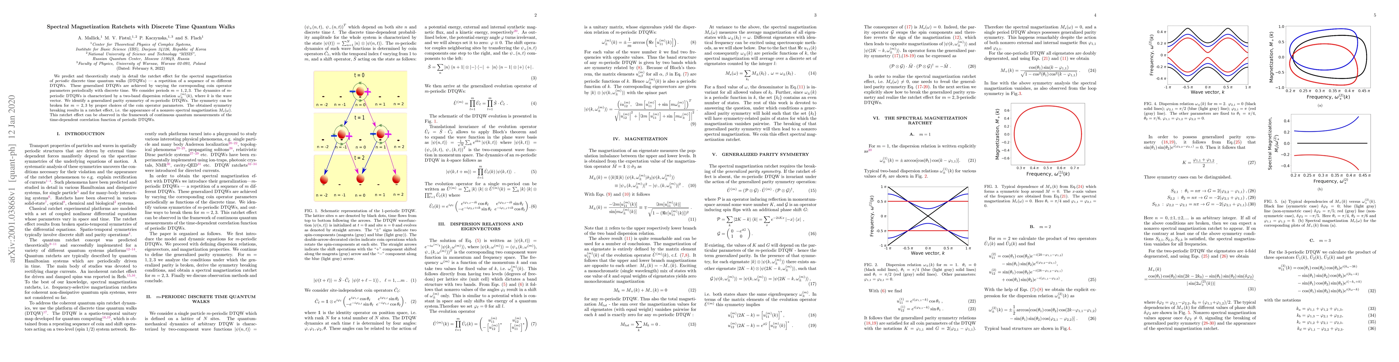 We predict and theoretically study in detail the ratchet effect for the spectral magnetization of periodic discrete time quantum walks (DTQWs) --- a repetition of a sequence of $m$ different DTQWs. These generalized DTQWs are achieved by varying the corresponding coin operator parameters periodically with discrete time. We consider periods $m=1,2,3$. The dynamics of $m$-periodic DTQWs is characterized by a two-band dispersion relation $\omega^{(m)}_{\pm}(k)$, where $k$ is the wave vector. We identify a generalized parity symmetry of $m$-periodic DTQWs. The symmetry can be broken for $m=2,3$ by proper choices of the coin operator parameters. The obtained symmetry breaking results in a ratchet effect, i.e. the appearance of a nonzero spectral magnetization $M_s(\omega)$. This ratchet effect can be observed in the framework of continuous quantum measurements of the time-dependent correlation function of periodic DTQWs.