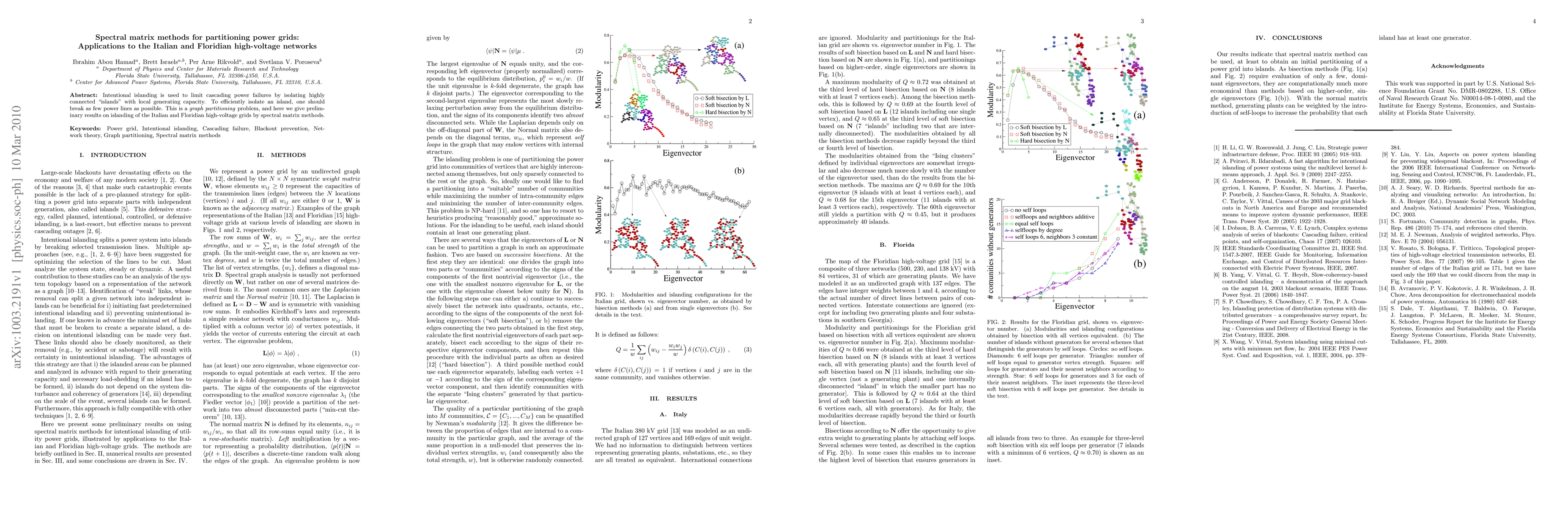 Intentional islanding is used to limit cascading power failures by isolating highly connected "islands" with local generating capacity. To efficiently isolate an island, one should break as few power lines as possible. This is a graph partitioning problem, and here we give preliminary results on islanding of the Italian and Floridian high-voltage grids by spectral matrix methods.