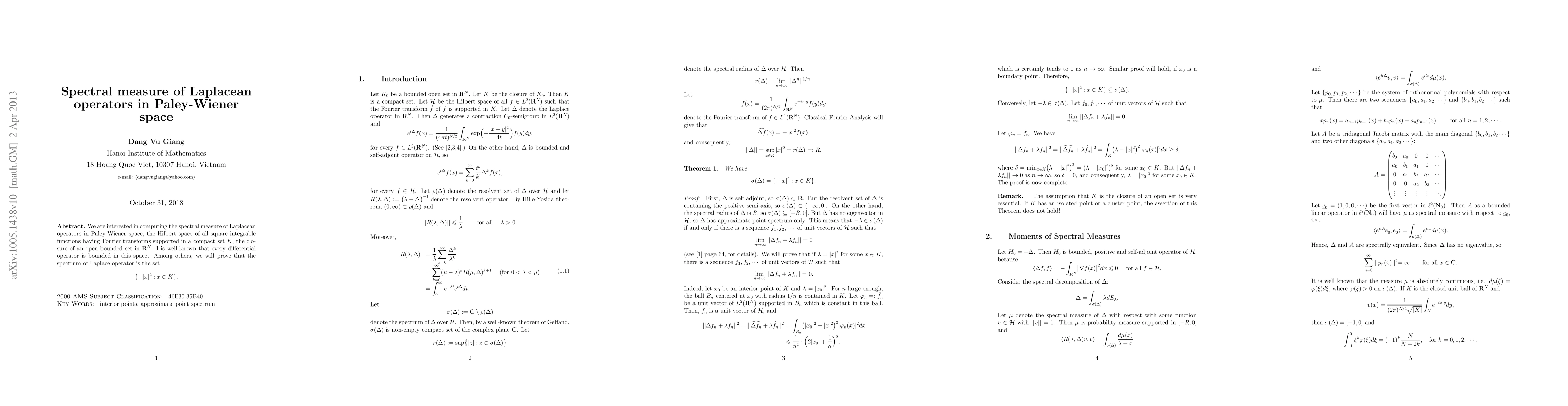 The paper investigates the spectral measure of Laplacean operators in Paley-Wiener space, finding that its spectrum is the set {-|x|^2: xγ K}, where K is a compact subset. This discovery has implications for differential equations and functional analysis.