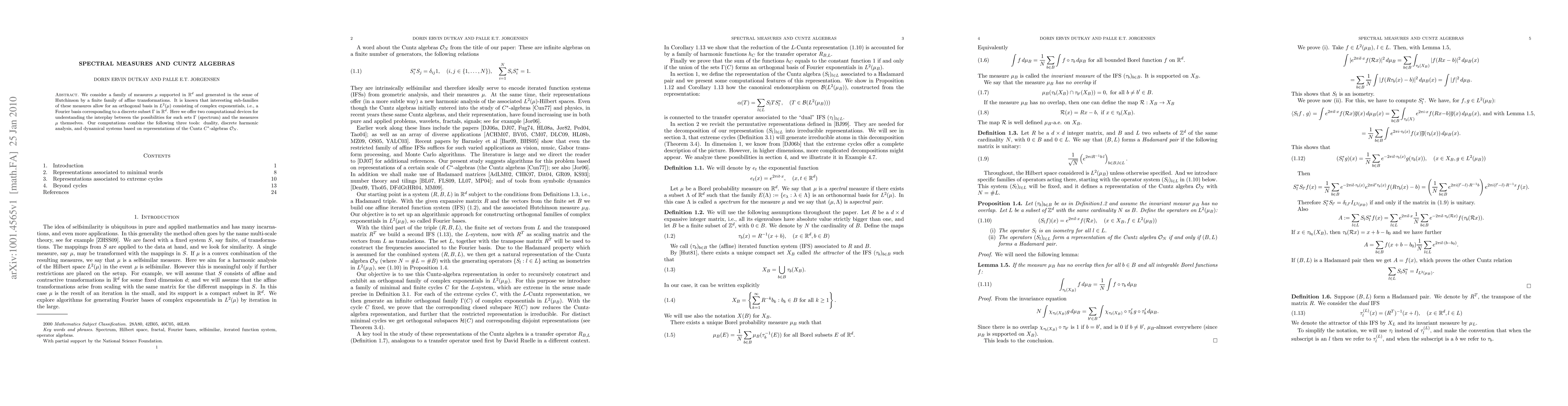 We consider a family of measures $\mu$ supported in $\br^d$ and generated in the sense of Hutchinson by a finite family of affine transformations. It is known that interesting sub-families of these measures allow for an orthogonal basis in $L^2(\mu)$ consisting of complex exponentials, i.e., a Fourier basis corresponding to a discrete subset $\Gamma$ in $\br^d$. Here we offer two computational devices for understanding the interplay between the possibilities for such sets $\Gamma$ (spectrum) and the measures $\mu$ themselves. Our computations combine the following three tools: duality, discrete harmonic analysis, and dynamical systems based on representations of the Cuntz $C^*$-algebras $\mathcal O_N$.