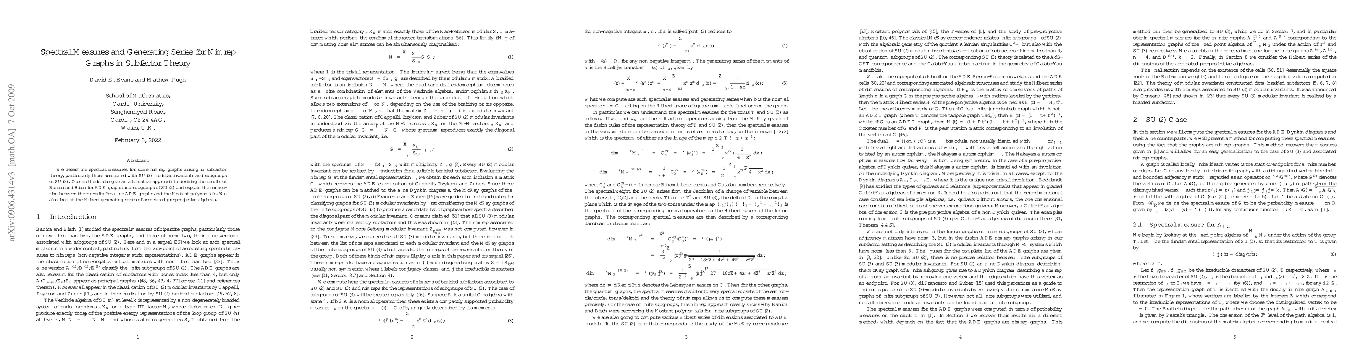 This paper determines spectral measures for nimrep graphs in subfactor theory, focusing on SU(3) modular invariants and their subgroups, and provides an alternative approach to results for ADE graphs and subgroups of SU(2). It also explores the Hilbert generating series associated with pre-projective algebras.