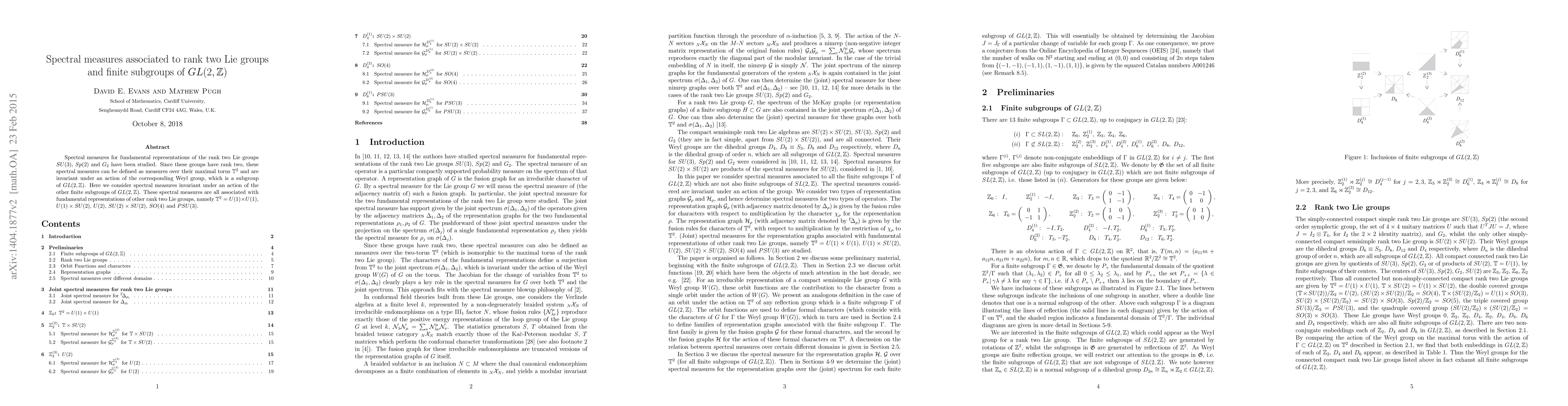 Spectral measures for fundamental representations of the rank two Lie groups $SU(3)$, $Sp(2)$ and $G_2$ have been studied. Since these groups have rank two, these spectral measures can be defined as measures over their maximal torus $\mathbb{T}^2$ and are invariant under an action of the corresponding Weyl group, which is a subgroup of $GL(2,\mathbb{Z})$. Here we consider spectral measures invariant under an action of the other finite subgroups of $GL(2,\mathbb{Z})$. These spectral measures are all associated with fundamental representations of other rank two Lie groups, namely $\mathbb{T}^2=U(1) \times U(1)$, $U(1) \times SU(2)$, $U(2)$, $SU(2) \times SU(2)$, $SO(4)$ and $PSU(3)$.