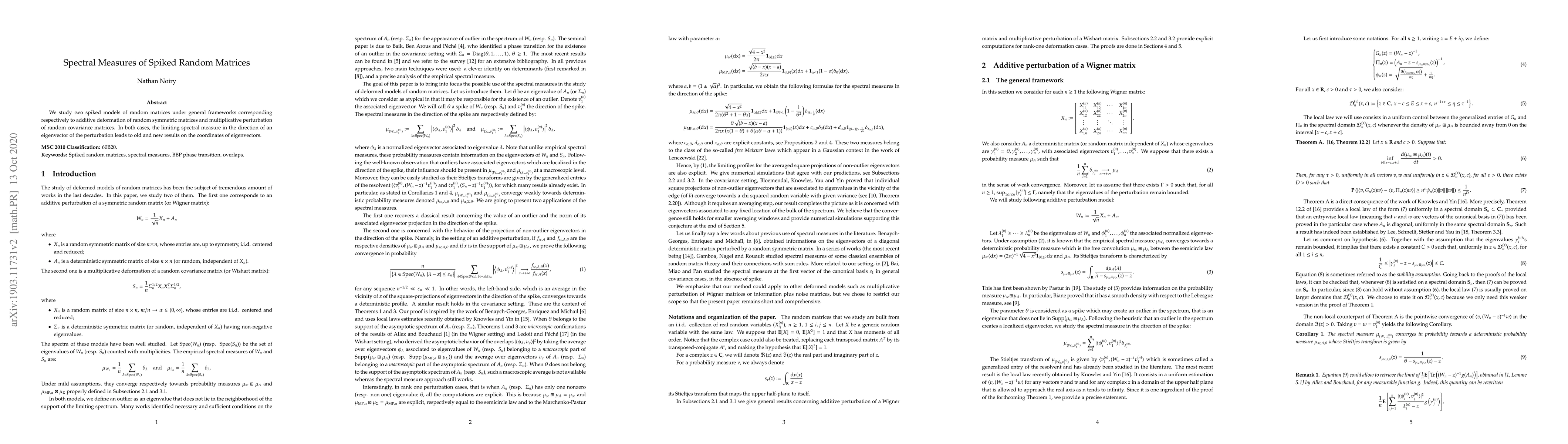 Summary: This paper investigates two spiked random matrix models, analyzing the additive deformation of random symmetric matrices and the multiplicative perturbation of random covariance matrices, and derives new insights into the spectral measures and eigenvector coordinates.