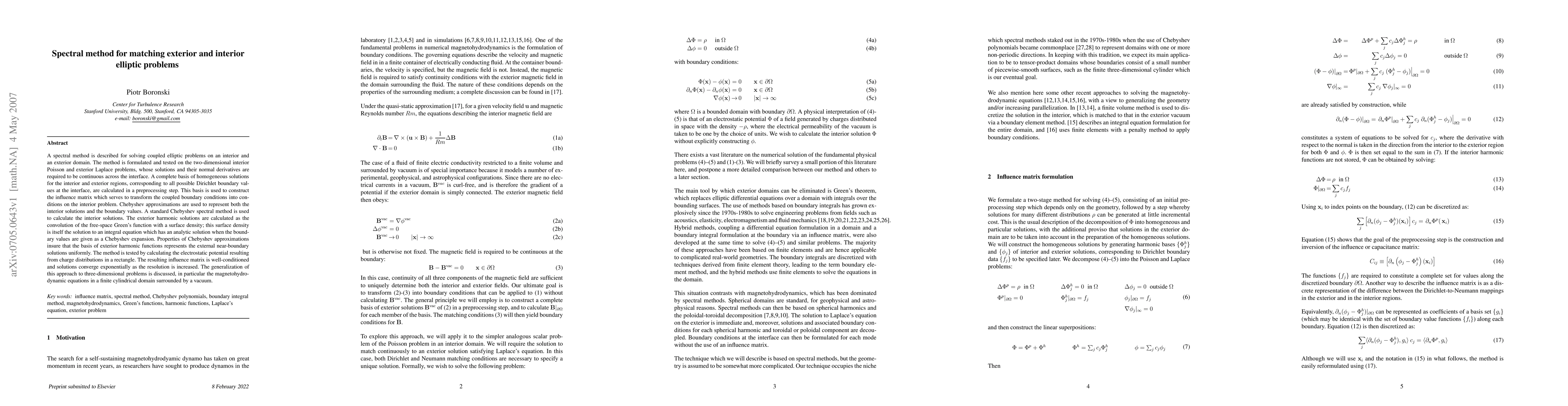 The paper proposes a spectral method for solving coupled elliptic problems in interior and exterior domains, employing Chebyshev approximations and a preprocessing step to construct an influence matrix transforming boundary conditions. The method is tested on 2D electrostatics and shows exponential convergence.