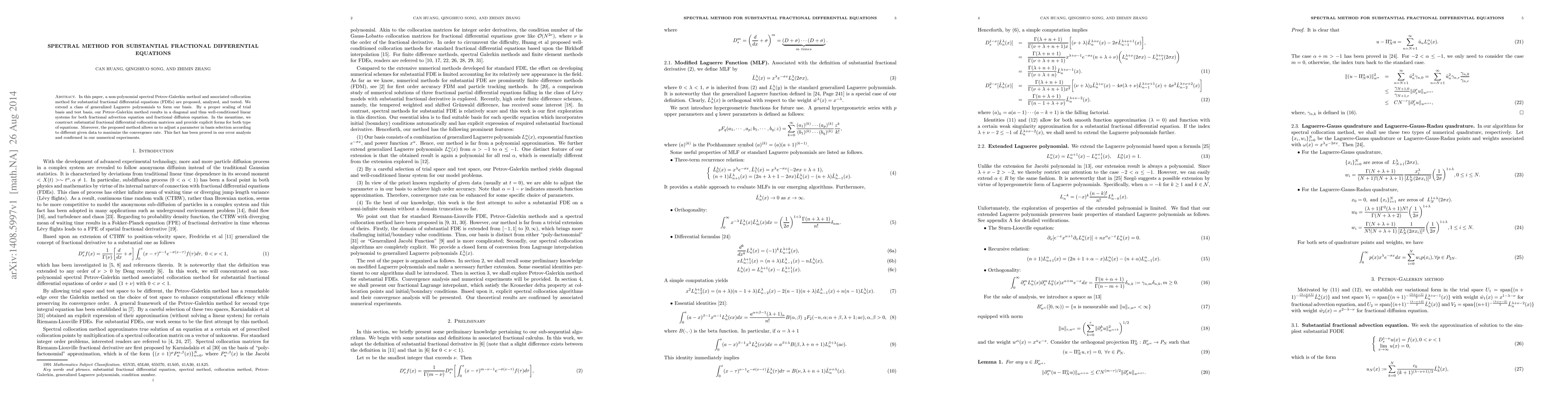 The paper proposes a non-polynomial spectral Petrov-Galerkin method and associated collocation method for substantial fractional differential equations (FDEs), extending a class of generalized Laguerre polynomials as basis. The method results in well-conditioned linear systems for both fractional advection and diffusion equations through proper scaling of trial and test spaces.