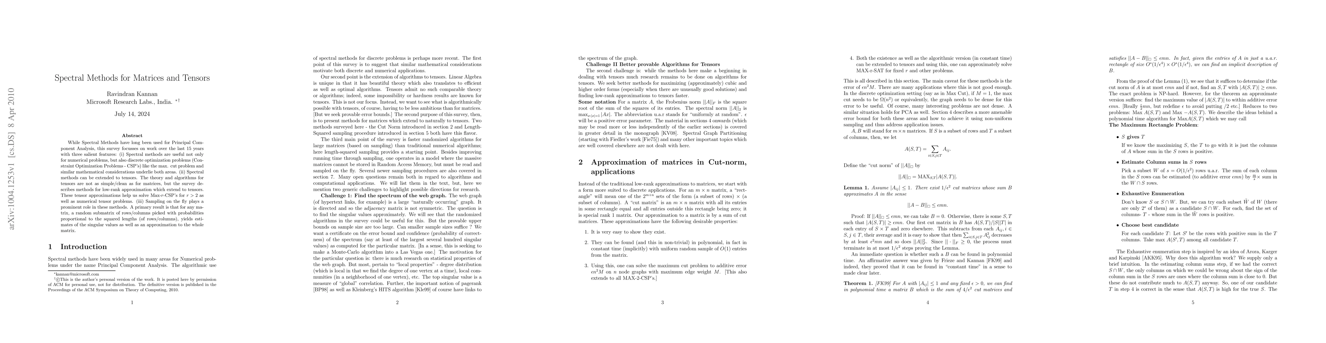 This survey highlights recent advancements in spectral methods for matrices and tensors, emphasizing their application to both numerical problems and discrete optimization, including the max cut problem. It also explores the extension of spectral methods to tensors for low-rank approximation and sampling techniques that yield effective matrix estimates.