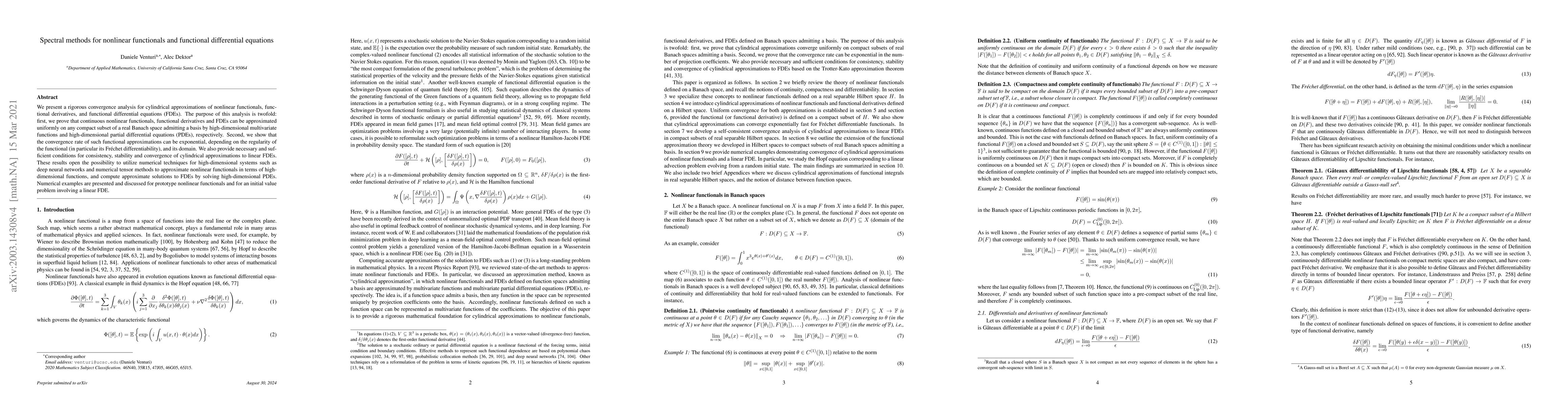 We present a rigorous convergence analysis for cylindrical approximations of nonlinear functionals, functional derivatives, and functional differential equations (FDEs). The purpose of this analysis is twofold: first, we prove that continuous nonlinear functionals, functional derivatives and FDEs can be approximated uniformly on any compact subset of a real Banach space admitting a basis by high-dimensional multivariate functions and high-dimensional partial differential equations (PDEs), respectively. Second, we show that the convergence rate of such functional approximations can be exponential, depending on the regularity of the functional (in particular its Fr\'echet differentiability), and its domain. We also provide necessary and sufficient conditions for consistency, stability and convergence of cylindrical approximations to linear FDEs. These results open the possibility to utilize numerical techniques for high-dimensional systems such as deep neural networks and numerical tensor methods to approximate nonlinear functionals in terms of high-dimensional functions, and compute approximate solutions to FDEs by solving high-dimensional PDEs. Numerical examples are presented and discussed for prototype nonlinear functionals and for an initial value problem involving a linear FDE.