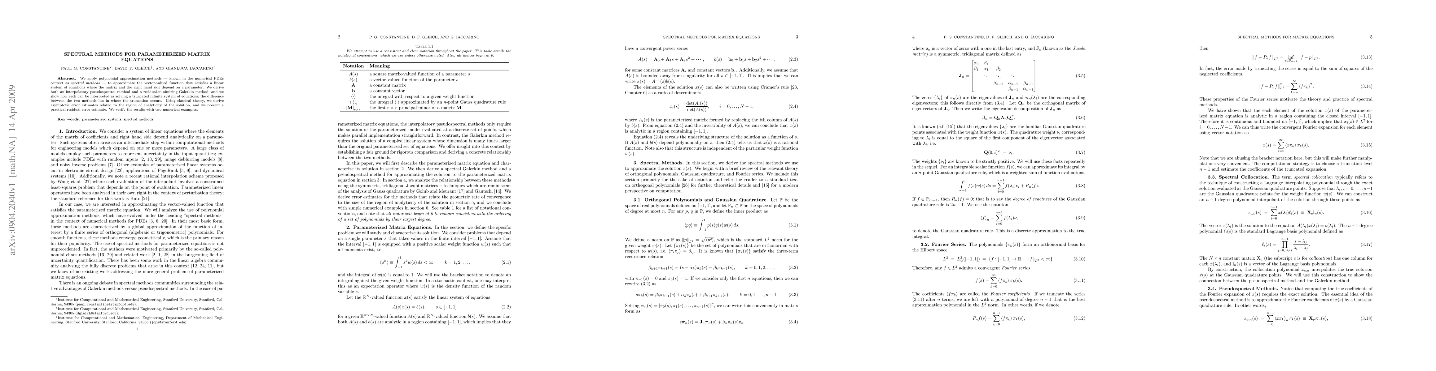 We apply polynomial approximation methods -- known in the numerical PDEs context as spectral methods -- to approximate the vector-valued function that satisfies a linear system of equations where the matrix and the right hand side depend on a parameter. We derive both an interpolatory pseudospectral method and a residual-minimizing Galerkin method, and we show how each can be interpreted as solving a truncated infinite system of equations; the difference between the two methods lies in where the truncation occurs. Using classical theory, we derive asymptotic error estimates related to the region of analyticity of the solution, and we present a practical residual error estimate. We verify the results with two numerical examples.