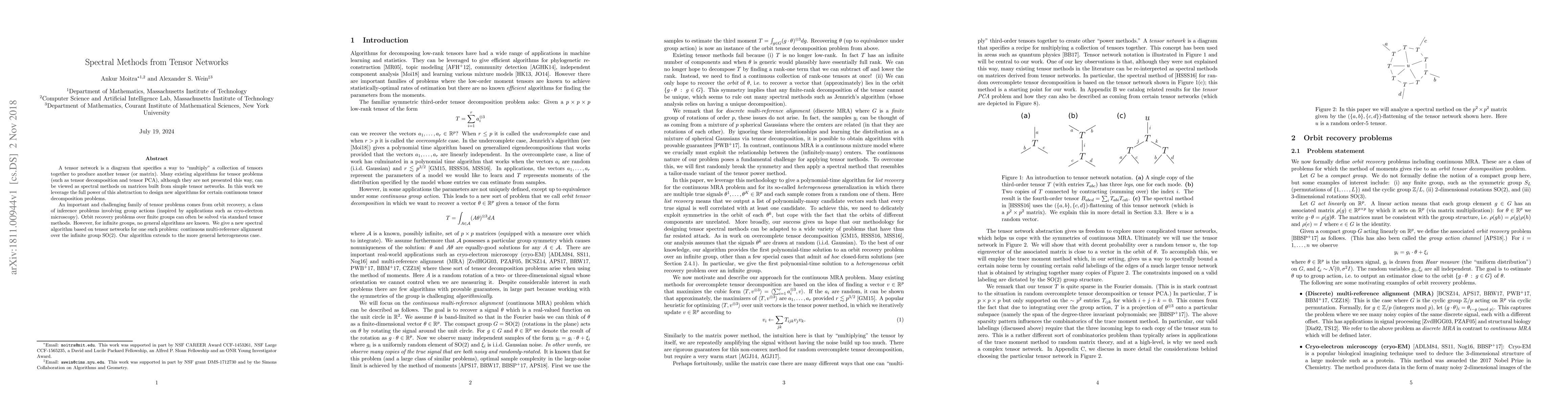 This paper introduces new spectral algorithms for continuous tensor decomposition problems using tensor networks. It specifically addresses the challenge of orbit recovery over infinite groups, like SO(2), where no general algorithms previously existed, extending to heterogeneous cases.