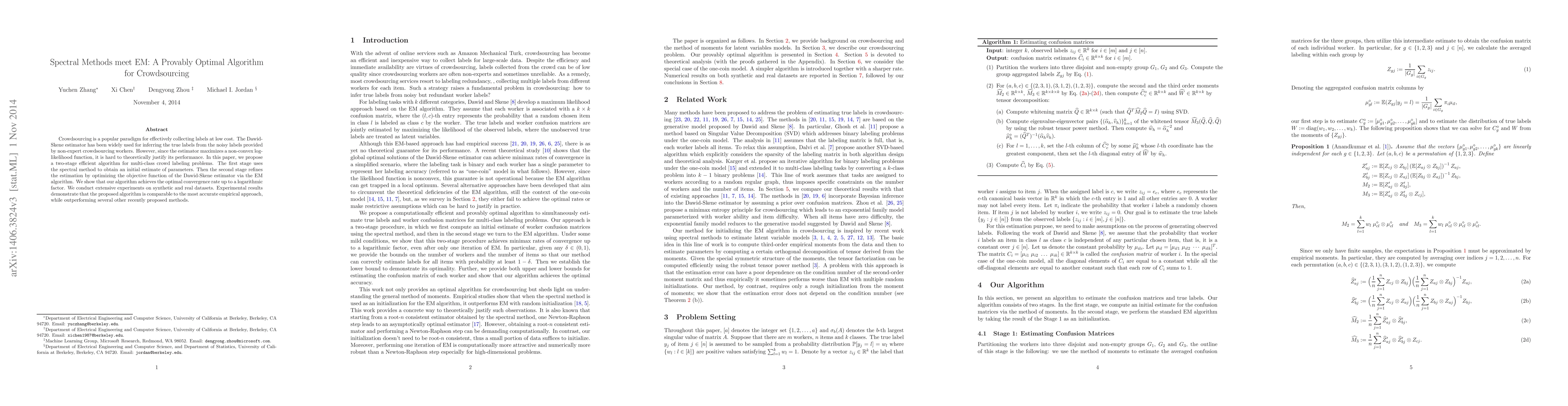 A new algorithm is proposed that combines spectral methods with the Expectation-Maximization (EM) algorithm to improve crowdsourcing label inference, achieving comparable accuracy to existing methods while outperforming others.