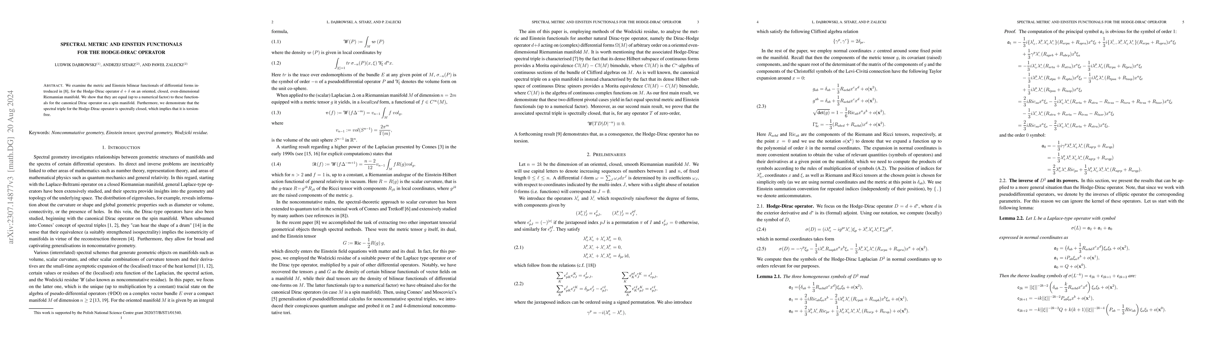 This paper investigates metric and Einstein functionals for the Hodge-Dirac operator $d+\delta$ on Riemannian manifolds, showing their equivalence to those for the canonical Dirac operator on spin manifolds, and proves the spectral triple's torsion-freeness through spectral closure.