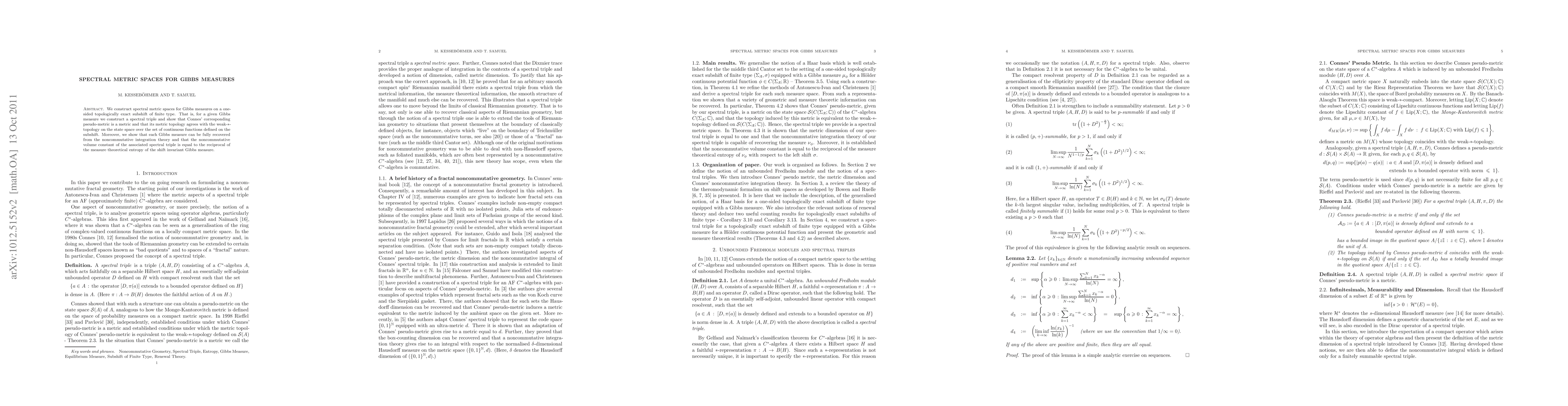 This paper constructs spectral metric spaces for Gibbs measures on a one-sided subshift, demonstrating that Connes' pseudo-metric is a metric matching the weak-*-topology. It also shows that Gibbs measures can be recovered from noncommutative integration theory, linking the noncommutative volume constant to the entropy of the measure.