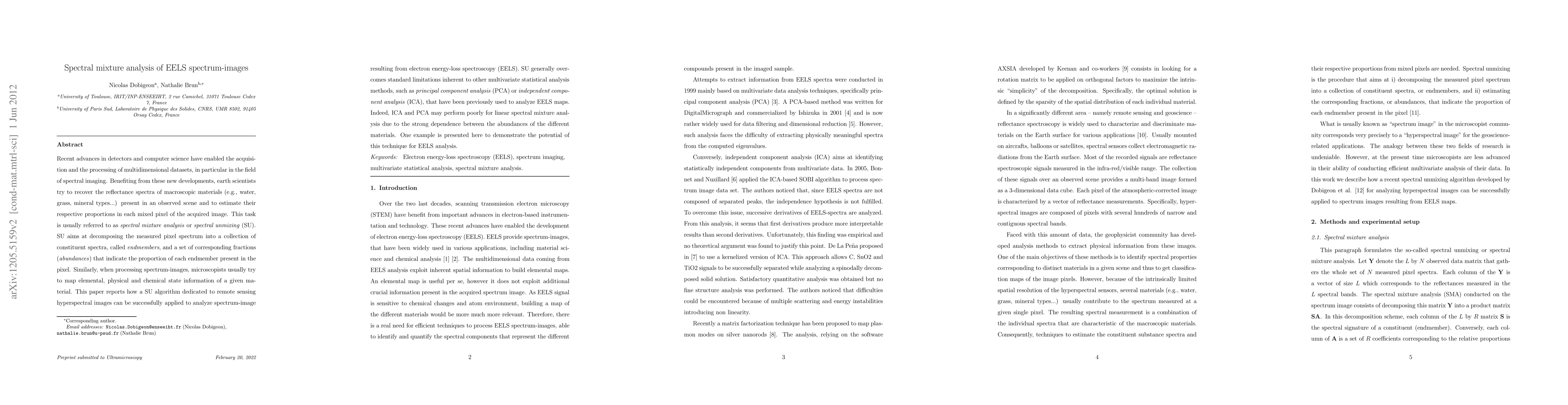 This paper demonstrates the application of spectral unmixing (SU) algorithms, originally developed for remote sensing hyperspectral images, to electron energy-loss spectroscopy (EELS) spectrum-images. The SU method effectively decomposes complex spectra into constituent endmembers and their proportions, overcoming limitations of PCA and ICA, and showcasing its potential for detailed microscopist analysis.