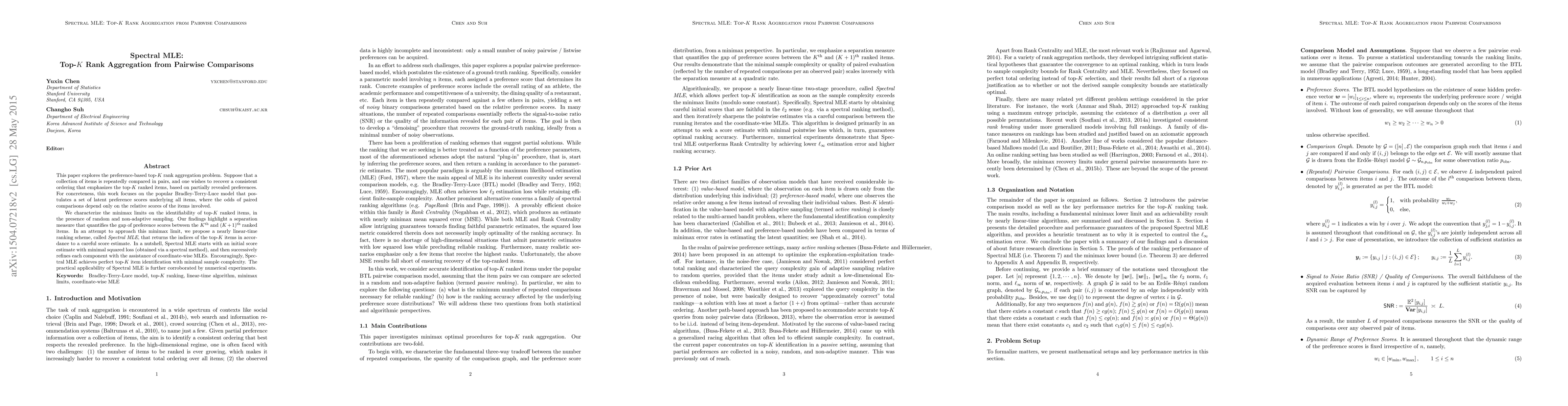 This paper proposes Spectral MLE, a nearly linear-time ranking scheme for top-$K$ rank aggregation from pairwise comparisons, achieving reliable identification with minimal sample complexity by leveraging a separation measure between top-ranked items. The method refines initial score estimates using spectral methods and coordinate-wise MLEs, validated by numerical experiments.