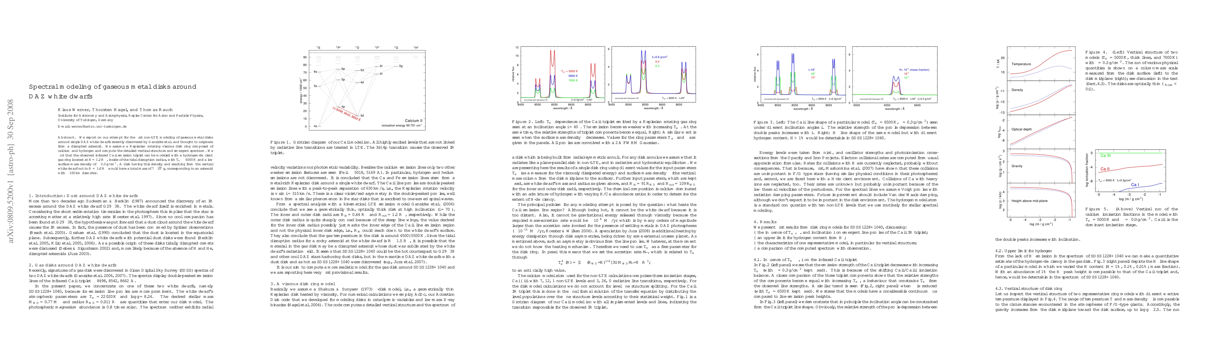 We report on our attempt for the first non-LTE modeling of gaseous metal disks around single DAZ white dwarfs recently discovered by Gaensicke et al. and thought to originate from a disrupted asteroid. We assume a Keplerian rotating viscous disk ring composed of calcium and hydrogen and compute the detailed vertical structure and emergent spectrum. We find that the observed infrared CaII emission triplet can be modeled with a hydrogen-deficient gas ring located at R=1.2 R_sun, inside of the tidal disruption radius, with Teff about 6000 K and a low surface mass density of about 0.3 g/cm**2. A disk having this density and reaching from the central white dwarf out to R=1.2 R_sun would have a total mass of 7 10**21 g, corresponding to an asteroid with about 160 km diameter.