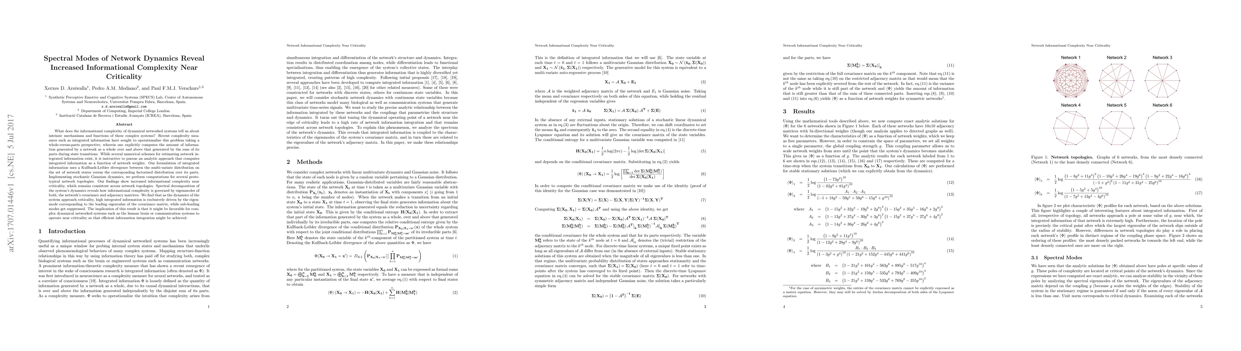 What does the informational complexity of dynamical networked systems tell us about intrinsic mechanisms and functions of these complex systems? Recent complexity measures such as integrated information have sought to operationalize this problem taking a whole-versus-parts perspective, wherein one explicitly computes the amount of information generated by a network as a whole over and above that generated by the sum of its parts during state transitions. While several numerical schemes for estimating network integrated information exist, it is instructive to pursue an analytic approach that computes integrated information as a function of network weights. Our formulation of integrated information uses a Kullback-Leibler divergence between the multi-variate distribution on the set of network states versus the corresponding factorized distribution over its parts. Implementing stochastic Gaussian dynamics, we perform computations for several prototypical network topologies. Our findings show increased informational complexity near criticality, which remains consistent across network topologies. Spectral decomposition of the system's dynamics reveals how informational complexity is governed by eigenmodes of both, the network's covariance and adjacency matrices. We find that as the dynamics of the system approach criticality, high integrated information is exclusively driven by the eigenmode corresponding to the leading eigenvalue of the covariance matrix, while sub-leading modes get suppressed. The implication of this result is that it might be favorable for complex dynamical networked systems such as the human brain or communication systems to operate near criticality so that efficient information integration might be achieved.