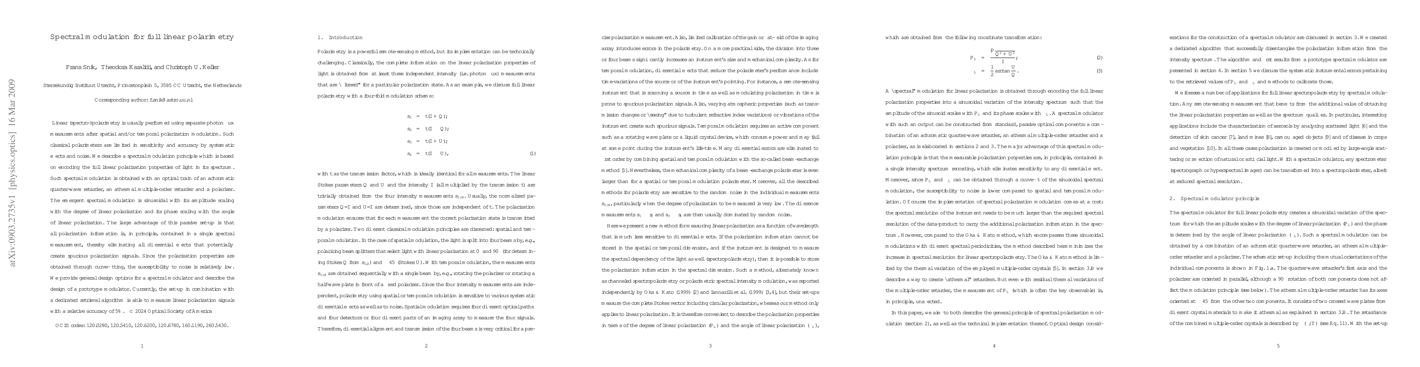 Linear (spectro) polarimetry is usually performed using separate photon flux measurements after spatial or temporal polarization modulation. Such classical polarimeters are limited in sensitivity and accuracy by systematic effects and noise. We describe a spectral modulation principle that is based on encoding the full linear polarization properties of light in its spectrum. Such spectral modulation is obtained with an optical train of an achromatic quarter-wave retarder, an athermal multiple-order retarder, and a polarizer. The emergent spectral modulation is sinusoidal with its amplitude scaling with the degree of linear polarization and its phase scaling with the angle of linear polarization. The large advantage of this passive setup is that all polarization information is, in principle, contained in a single spectral measurement, thereby eliminating all differential effects that potentially create spurious polarization signals. Since the polarization properties are obtained through curve fitting, the susceptibility to noise is relatively low. We provide general design options for a spectral modulator and describe the design of a prototype modulator. Currently, the setup in combination with a dedicated retrieval algorithm can be used to measure linear polarization signals with a relative accuracy of 5%.