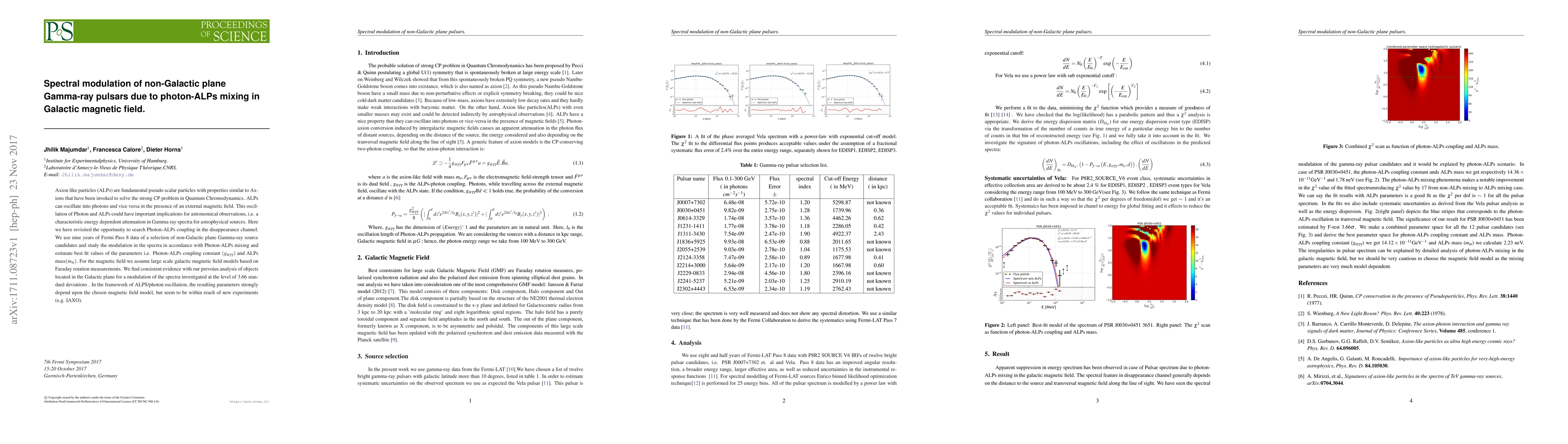 In many approaches to describe physics beyond the standard model, light Nambu-Goldstone bosons (named axion-like particles or ALPS for their similarity with the axion) are predicted to exist. For ALPs with a mass of neV, photon-ALPs oscillation takes place in extra-galactic magnetic fields during the propagation of very high energy gamma-ray photons leading to excess radiation observed for optically thick sources. In order to verify this effect, gamma-ray spectra from strong Galactic plane or non-galactic plane sources can be used and the photon-ALPs mixing would lead to an energy dependent suppression of the observed gamma-ray spectra. Here, we have used Fermi-LAT observations of a sample of non Galactic plane gamma-ray pulsars located at different line-of-sights to search for spectral signatures and compare the result with the predictions using particular models for the Galactic magnetic field.We find consistent evidence with our prevoius analysis of objects located in the Galactic plane for a modulation of the spectra investigated at the level of 3.66 standard deviations . In the framework of ALPS-photon oscillation, the resulting parameters strongly depend upon the chosen magnetic field model, but seem to be within reach of new experiments(e.g. IAXO).