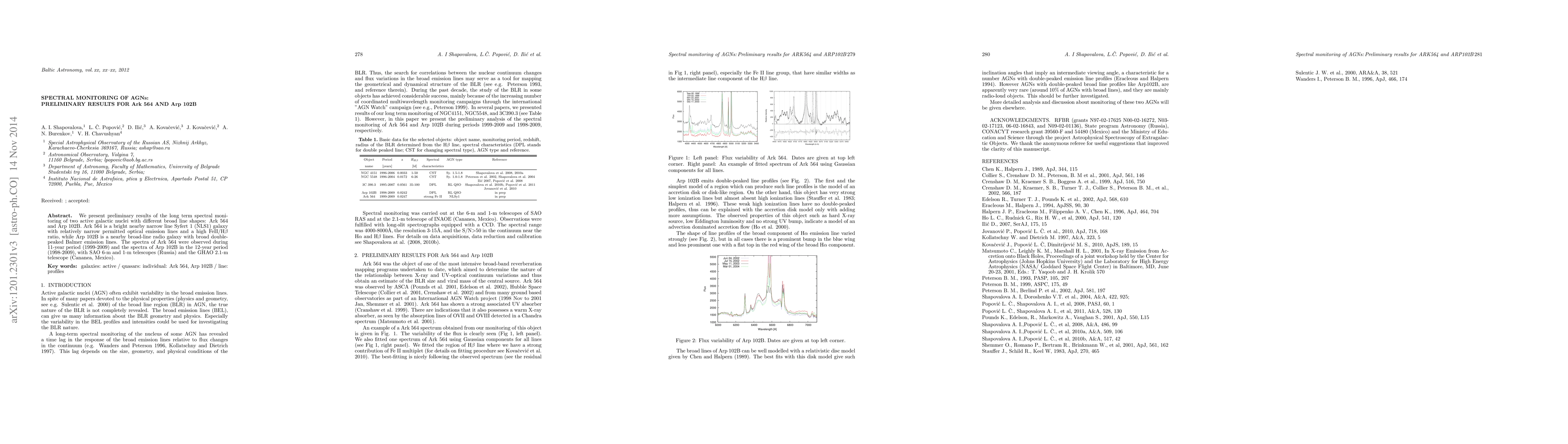 We present preliminary results of the long term spectral monitoring of two active galactic nuclei with different broad line shapes: Ark 564 and Arp 102B. Ark 564 is a bright nearby narrow line Syfert 1 (NLS1) galaxy with relatively narrow permitted optical emission lines and a high FeII/H${\beta}$ ratio, while Arp 102B is a nearby broad-line radio galaxy with broad double-peaked Balmer emission lines. The spectra of Ark 564 were observed during 11-year period (1999-2009) and the spectra of Arp 102B in the 12-year period (1998-2009), with SAO 6-m and 1-m telescopes (Russia) and the GHAO 2.1-m telescope (Cananea, Mexico).