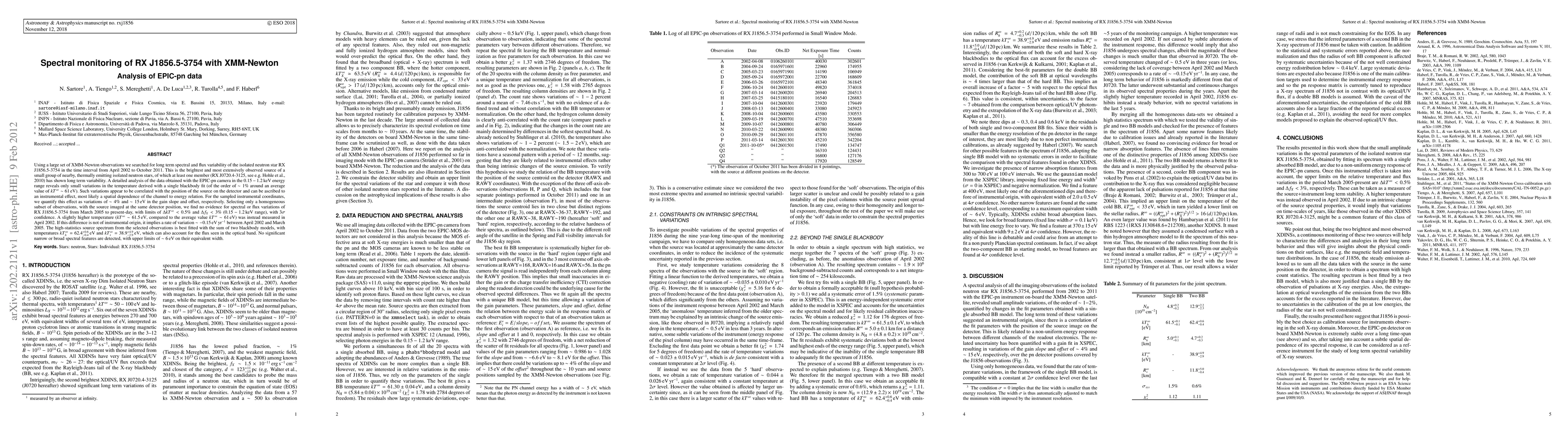Using a large set of XMM-Newton observations we searched for long term spectral and flux variability of the isolated neutron star RX J1856.5-3754 in the time interval from April 2002 to October 2011. This is the brightest and most extensively observed source of a small group of nearby, thermally emitting isolated neutron stars, of which at least one member (RX J0720.4-3125, Hohle et al., 2010) has shown long term variability. A detailed analysis of the data obtained with the EPIC-pn camera in the 0.15-1.2 keV energy range reveals small variations in the temperature derived with a single blackbody fit (of the order of 1% around kT^inf \sim 61 eV). Such variations are correlated with the position of the source on the detector and can be ascribed to an instrumental effect, most likely a spatial dependence of the channel to energy relation. For the sampled instrumental coordinates, we quantify this effect as variations of \sim 4% and \sim 15 eV in the gain slope and offset, respectively. Selecting only a homogeneous subset of observations, with the source imaged at the same detector position, we find no evidence for spectral or flux variations of RX J1856.5-3754 from March 2005 to present-day, with limits of Delta kT^inf < 0.5% and Delta f_X < 3% (0.15-1.2 keV), with 3sigma confidence. A slightly higher temperature (kT^inf \sim 61.5 eV, compared to kT^\inf \sim 61 eV) was instead measured in April 2002. If this difference is not of instrumental origin, it implies a rate of variation \sim -0.15 eV yr^-1 between April 2002 and March 2005. The high-statistics spectrum from the selected observations is best fitted with the sum of two blackbody models, with temperatures kT_h^inf = 62.4_{-0.4}^{+0.6} eV and kT_s^\inf = 38.9_{-2.9}^{+4.9} eV, which account for the flux seen in the optical band. No significant spectral features are detected, with upper limits of 6 eV on their equivalent width.