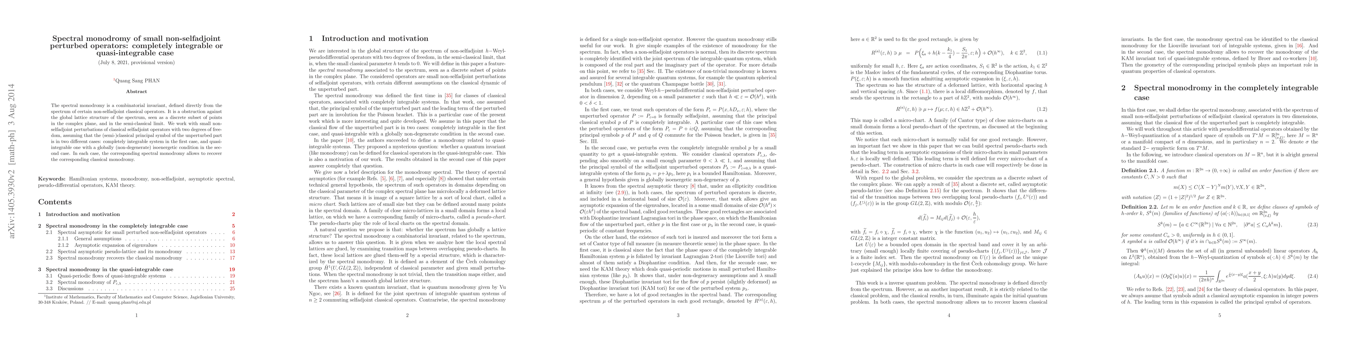 We build a combinatorial invariant, called the spectral monodromy from the spectrum of a non-selfadjoint h -pseudodifferential operator with two degrees of freedom in the semi-classical limit. We treat small non-selfadjoint perturbation of selfadjoint h-pseudodifferential operators in two case: in the first, we assume that the classical flow of the unperturbed part is integrable; the second case, more interesting, when this flow is assumed to be quasi-integrable.