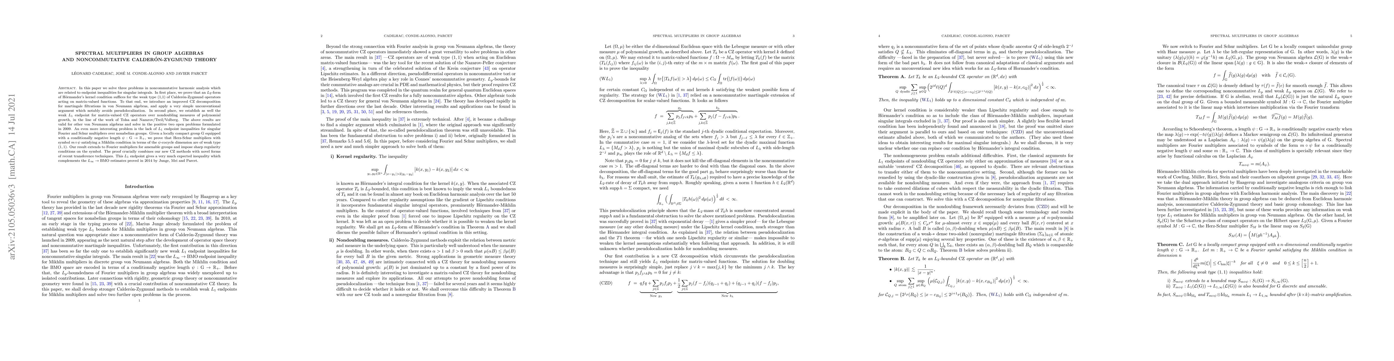 In this paper we solve three problems in noncommutative harmonic analysis which are related to endpoint inequalities for singular integrals. In first place, we prove that an $L_2$-form of H\"ormander's kernel condition suffices for the weak type (1,1) of Calder\'on-Zygmund operators acting on matrix-valued functions. To that end, we introduce an improved CZ decomposition for martingale filtrations in von Neumann algebras, and apply a very simple unconventional argument which notably avoids pseudolocalization. In second place, we establish as well the weak $L_1$ endpoint for matrix-valued CZ operators over nondoubling measures of polynomial growth, in the line of the work of Tolsa and Nazarov/Treil/Volberg. The above results are valid for other von Neumann algebras and solve in the positive two open problems formulated in 2009. An even more interesting problem is the lack of $L_1$ endpoint inequalities for singular Fourier and Schur multipliers over nonabelian groups. Given a locally compact group G equipped with a conditionally negative length $\psi: \mathrm{G} \to \mathbb{R}_+$, we prove that Herz-Schur multipliers with symbol $m \circ \psi$ satisfying a Mikhlin condition in terms of the $\psi$-cocycle dimension are of weak type $(1,1)$. Our result extends to Fourier multipliers for amenable groups and impose sharp regularity conditions on the symbol. The proof crucially combines our new CZ methods with novel forms of recent transference techniques. This $L_1$ endpoint gives a very much expected inequality which complements the $L_\infty \to \mathrm{BMO}$ estimates proved in 2014 by Junge, Mei and Parcet.