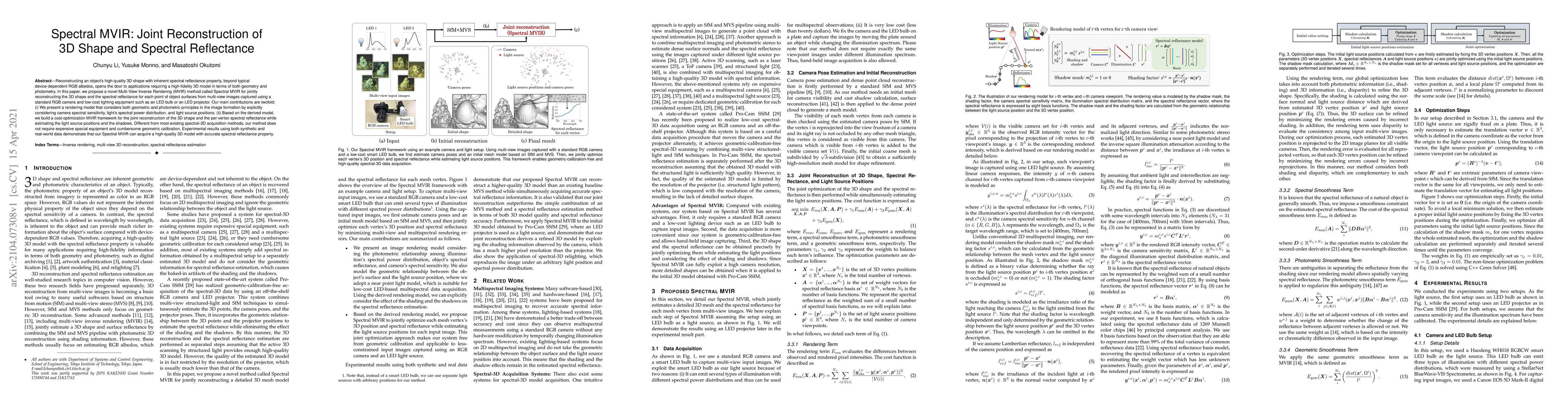 This paper introduces Spectral MVIR, a novel method for reconstructing 3D object shapes with spectral reflectance properties using standard RGB cameras and affordable lighting. It presents a rendering model considering both geometric and photometric principles, and a cost-optimization framework for joint reconstruction of 3D shape, spectral reflectance, light source positions, and shadows. Unlike existing methods, it doesn't require costly or complex equipment and offers accurate spectral reflectance through experiments on synthetic and real-world data.