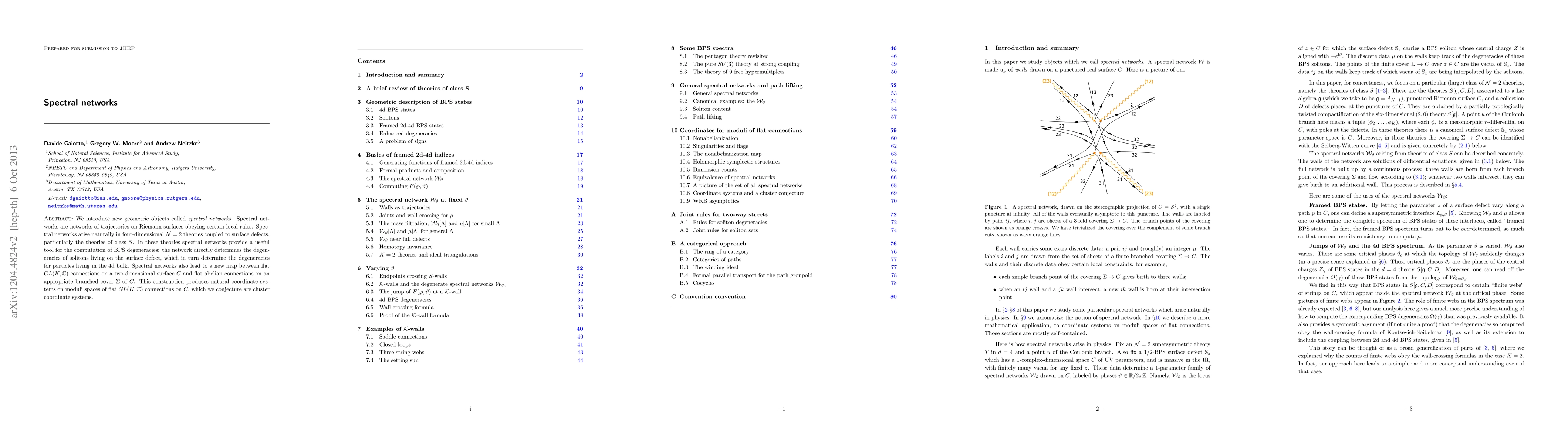 This paper introduces spectral networks, geometric objects on Riemann surfaces that arise in four-dimensional N=2 theories coupled to surface defects, particularly in class S theories. These networks are crucial for computing BPS degeneracies and also create a new map between flat GL(K,C) connections and flat abelian connections, producing cluster coordinate systems on moduli spaces.