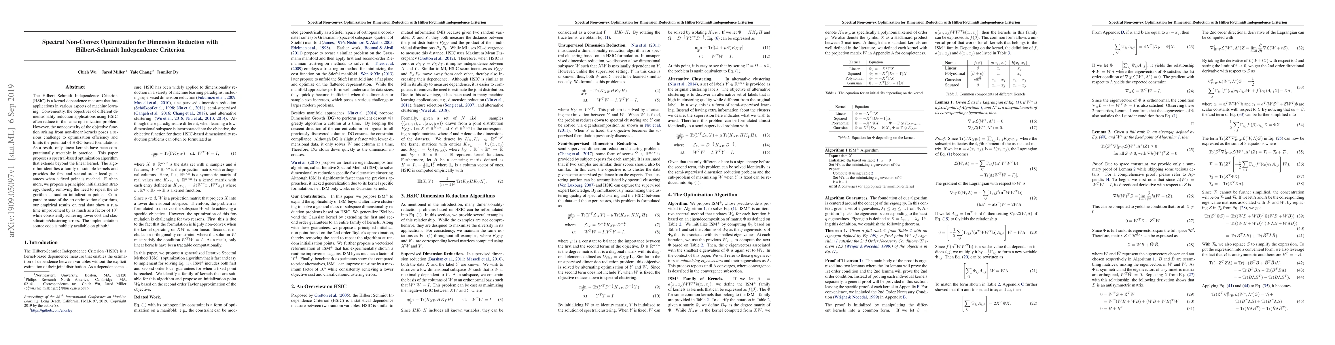 This paper proposes a spectral non-convex optimization algorithm for dimensionality reduction using the Hilbert-Schmidt Independence Criterion (HSIC), addressing the computational challenges posed by non-linear kernels. The approach achieves significant run-time improvements and better performance compared to existing methods.