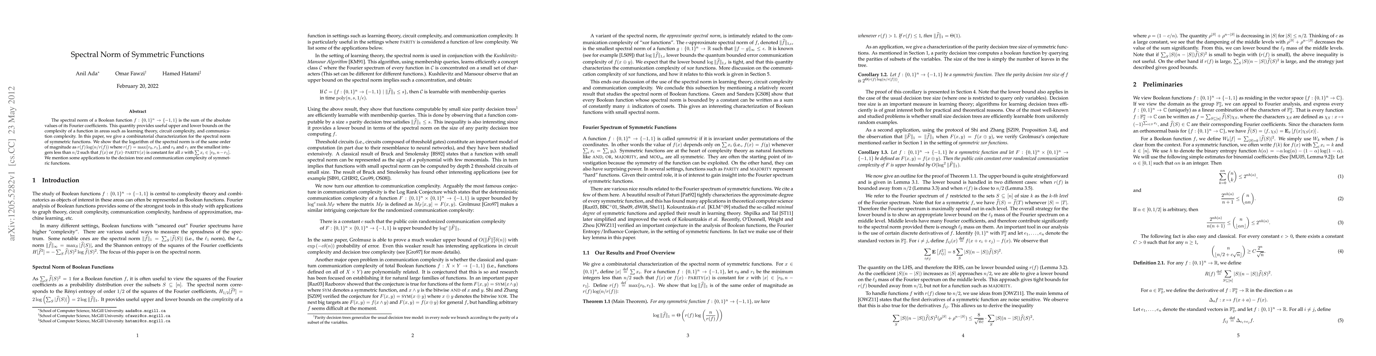 This paper provides a combinatorial characterization of the spectral norm of symmetric Boolean functions, showing that its logarithm scales with $r(f)\log(n/r(f))$, where $r(f)$ is defined based on the smallest integers making the function constant. Applications to decision tree and communication complexity of symmetric functions are also discussed.