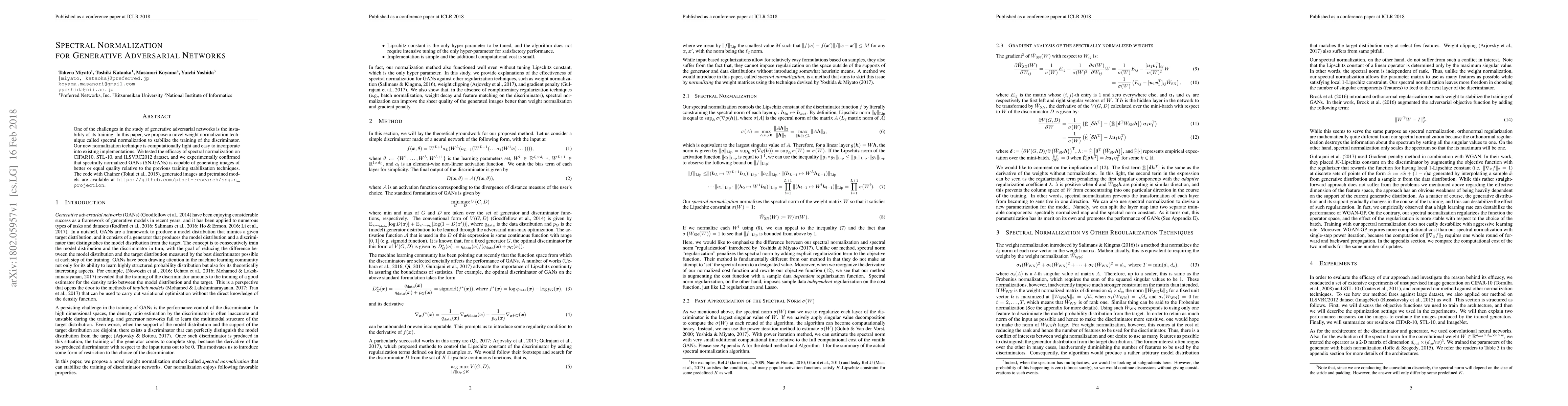 This paper introduces spectral normalization, a new weight normalization technique to stabilize GAN discriminator training, which is computationally efficient and easy to integrate. Experimental results on CIFAR10, STL-10, and ILSVRC2012 datasets show that spectrally normalized GANs generate images of improved or equal quality compared to previous methods.