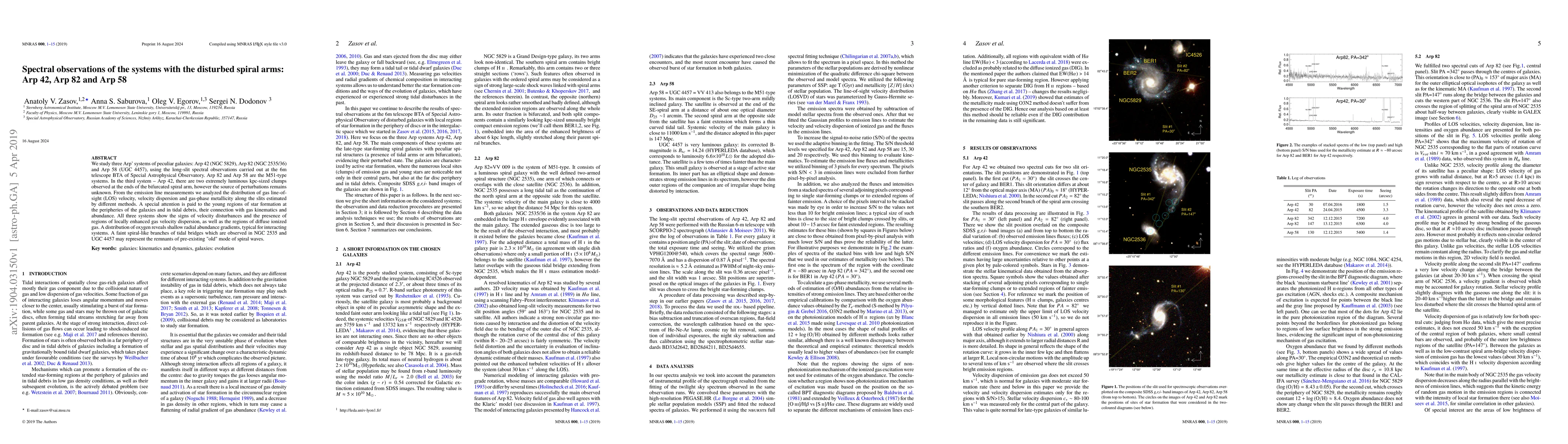 This study uses spectral observations from the 6m BTA telescope to examine three Arp peculiar galaxy systems: Arp 42, Arp 82, and Arp 58. Findings reveal velocity disturbances, regions of heightened gas velocity dispersion, and diffuse ionized gas in all systems. Shallow oxygen abundance gradients, typical of interacting systems, are also noted. Arp 42 exhibits two luminous kpc-sized clumps, while Arp 82 and Arp 58 show M51-type structures. Faint spiral branches in two systems hint at remnants of pre-existing spiral waves.