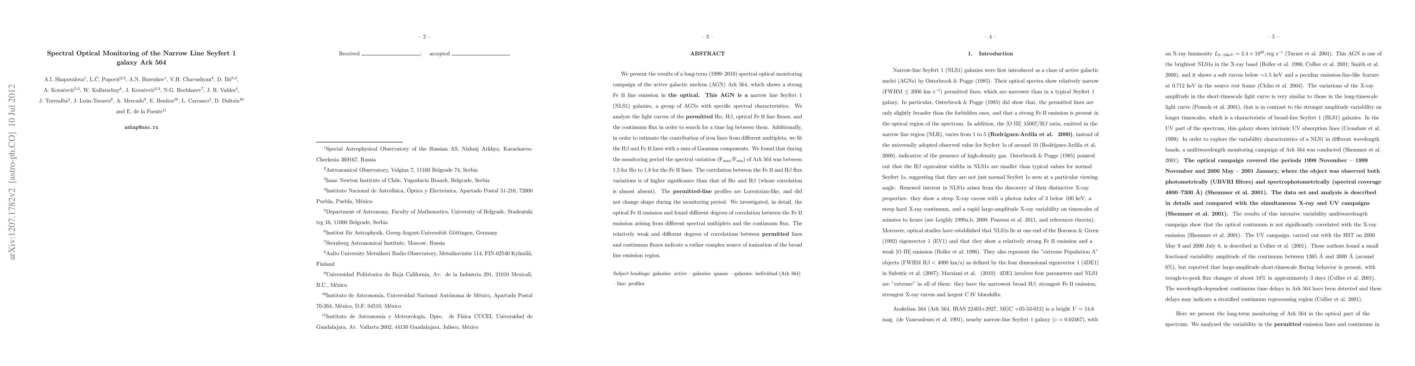 We present the results of a long-term (1999--2010) spectral optical monitoring campaign of the active galactic nucleus (AGN) Ark 564, which shows a strong Fe II line emission in the optical. This AGN is a narrow line Seyfert 1 (NLS1) galaxies, a group of AGNs with specific spectral characteristics. We analyze the light curves of the permitted Ha, Hb, optical Fe II line fluxes, and the continuum flux in order to search for a time lag between them. Additionally, in order to estimate the contribution of iron lines from different multiplets, we fit the Hb and Fe II lines with a sum of Gaussian components. We found that during the monitoring period the spectral variation (F_max/F_min) of Ark 564 was between 1.5 for Ha to 1.8 for the Fe II lines. The correlation between the Fe II and Hb flux variations is of higher significance than that of Ha and Hb (whose correlation is almost absent). The permitted-line profiles are Lorentzian-like, and did not change shape during the monitoring period. We investigated, in detail, the optical Fe II emission and found different degrees of correlation between the Fe II emission arising from different spectral multiplets and the continuum flux. The relatively weak and different degrees of correlations between permitted lines and continuum fluxes indicate a rather complex source of ionization of the broad line emission region.
