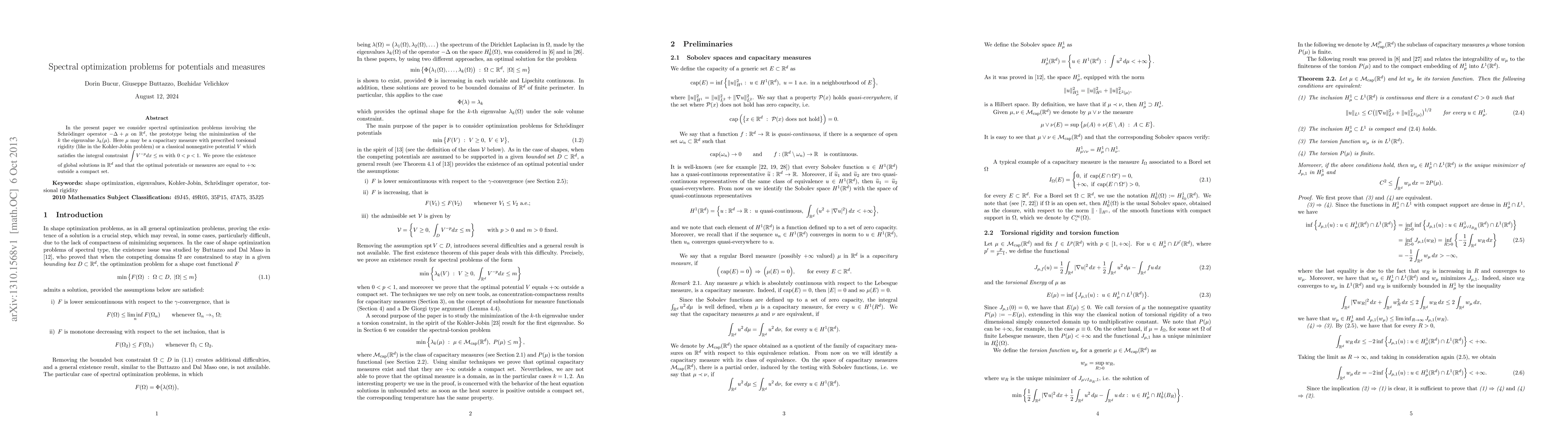 In the present paper we consider spectral optimization problems involving the Schr\"odinger operator $-\Delta +\mu$ on $\R^d$, the prototype being the minimization of the $k$ the eigenvalue $\lambda_k(\mu)$. Here $\mu$ may be a capacitary measure with prescribed torsional rigidity (like in the Kohler-Jobin problem) or a classical nonnegative potential $V$ which satisfies the integral constraint $\ds \int V^{-p}dx \le m$ with $0