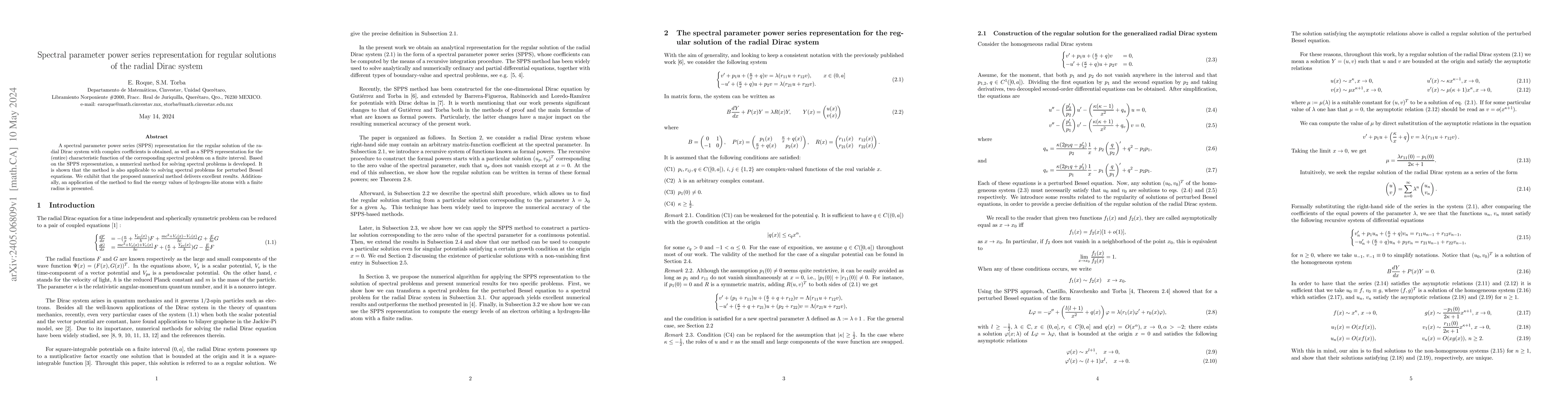 Summary: The paper develops a spectral parameter power series representation for regular solutions of the radial Dirac system and its characteristic function, enabling a numerical method for spectral problems. This method also applies to perturbed Bessel equations and successfully calculates energy values for hydrogen-like atoms with a finite radius.