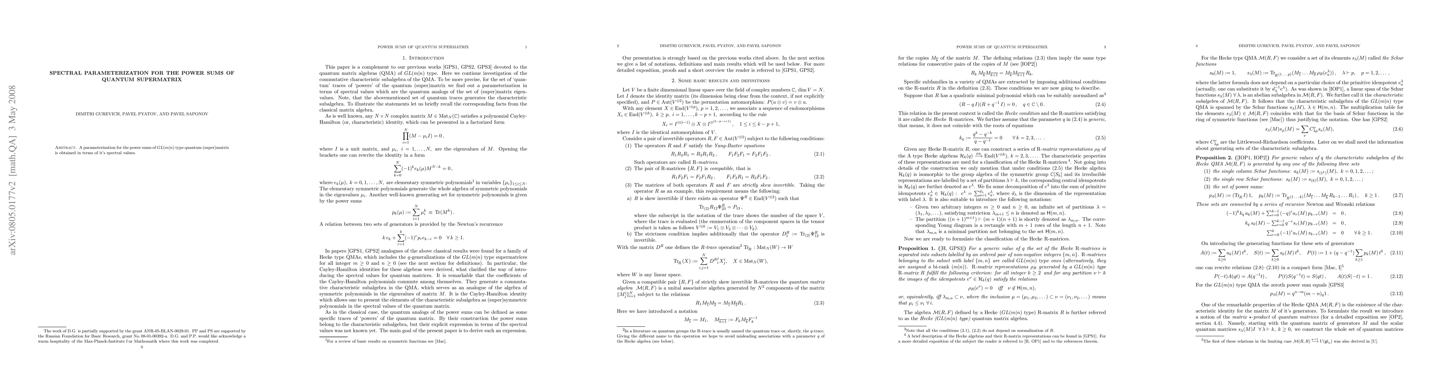 The paper presents a method to parameterize the power sums of a GL(m|n) type quantum supermatrix using its spectral values, providing a novel approach to understanding these complex quantum structures. This parameterization enhances the analytical tractability of power sums in quantum supermatrix theory.
