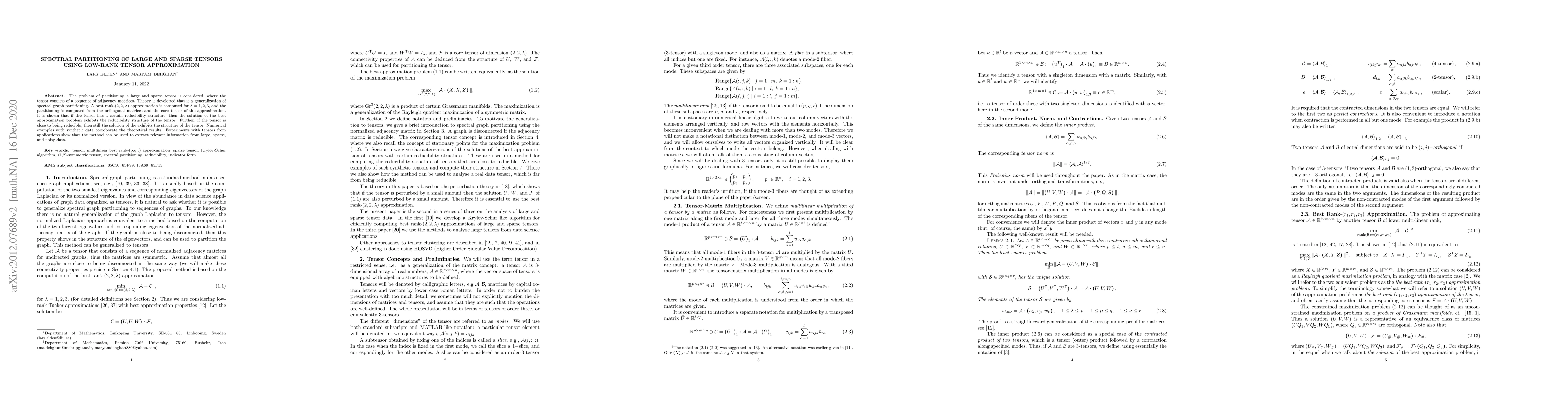 The problem of partitioning a large and sparse tensor is considered, where the tensor consists of a sequence of adjacency matrices. Theory is developed that is a generalization of spectral graph partitioning. A best rank-$(2,2,\lambda)$ approximation is computed for $\lambda=1,2,3$, and the partitioning is computed from the orthogonal matrices and the core tensor of the approximation. It is shown that if the tensor has a certain reducibility structure, then the solution of the best approximation problem exhibits the reducibility structure of the tensor. Further, if the tensor is close to being reducible, then still the solution of the exhibits the structure of the tensor. Numerical examples with synthetic data corroborate the theoretical results. Experiments with tensors from applications show that the method can be used to extract relevant information from large, sparse, and noisy data.