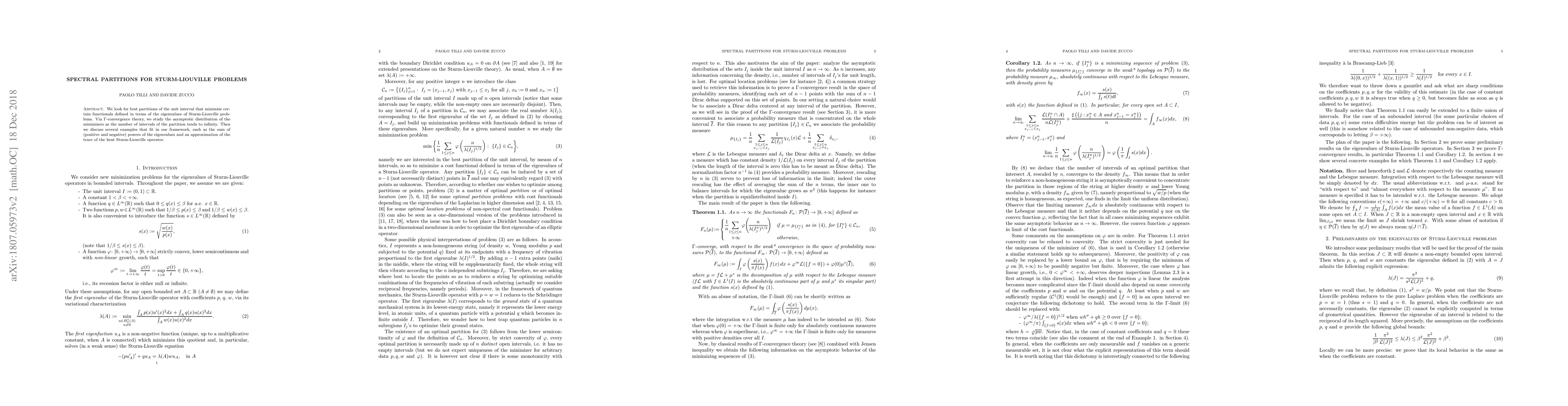 This paper explores optimal partitions of the unit interval that minimize functionals based on Sturm-Liouville eigenvalues, using Γ-convergence theory to analyze the asymptotic distribution of these partitions. It also examines specific examples, including sums of eigenvalues and approximations of the heat operator trace.