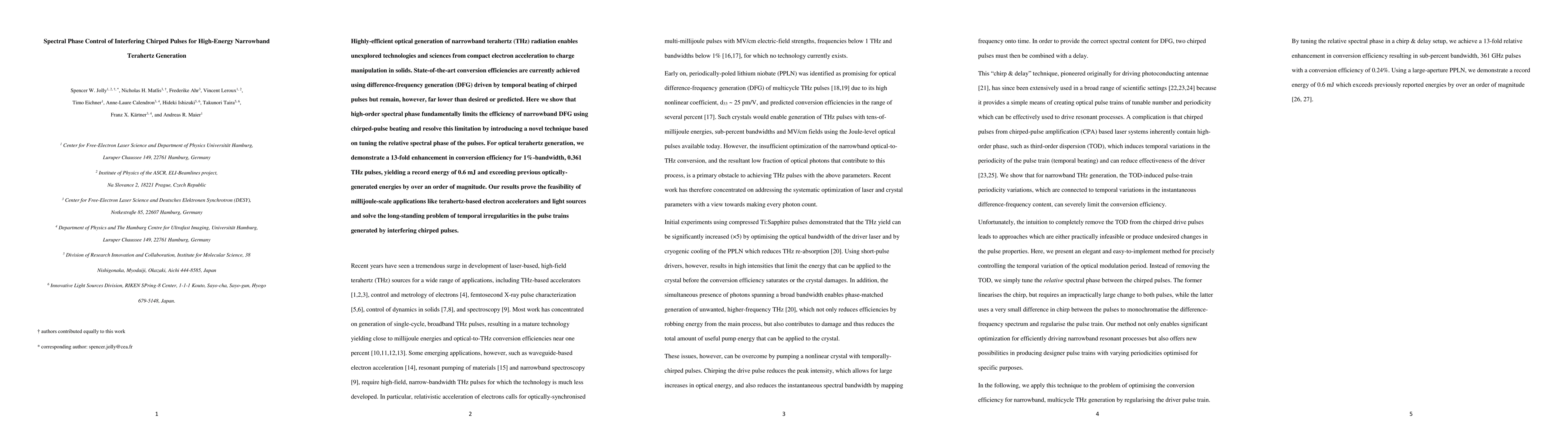 This paper presents a novel technique to enhance the efficiency of narrowband terahertz generation via spectral phase control of interfering chirped pulses, achieving a 13-fold increase in conversion efficiency and setting a new record for generated energy. This breakthrough addresses long-standing limitations in temporal irregularities and opens pathways for advanced applications like terahertz-based electron accelerators.