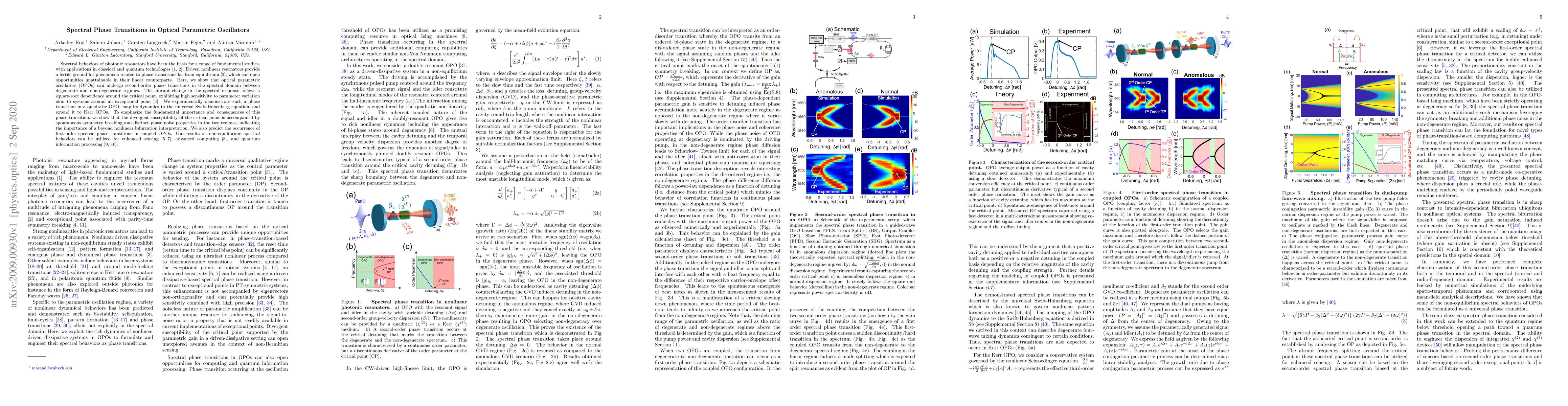 This paper demonstrates that optical parametric oscillators (OPOs) exhibit second-order phase transitions in their spectral domain, characterized by a square-root dependence near the critical point. The study reveals spontaneous symmetry breaking and distinct phase noise properties, suggesting beyond nonlinear bifurcation implications, and predicts first-order spectral phase transitions in coupled OPOs, with potential applications in sensing, computing, and quantum information processing.
