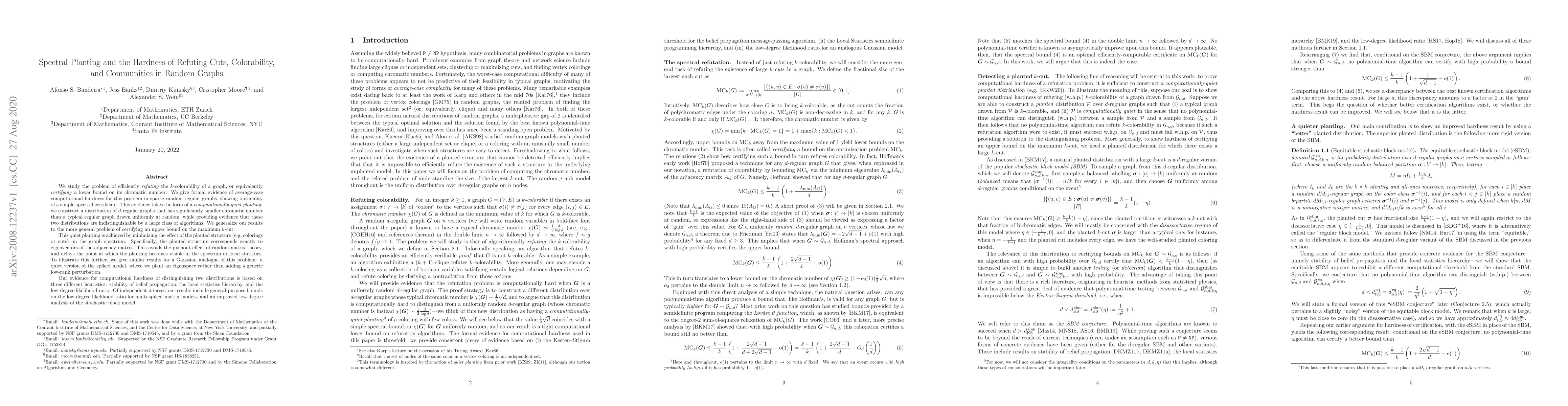 This paper demonstrates the computational hardness of refuting k-colorability in sparse random regular graphs by introducing a "quiet planting" technique that minimizes the impact of planted structures on the graph spectrum. The authors show that their planted graphs are indistinguishable from typical random graphs by a large class of algorithms, providing evidence for the average-case hardness of the problem.