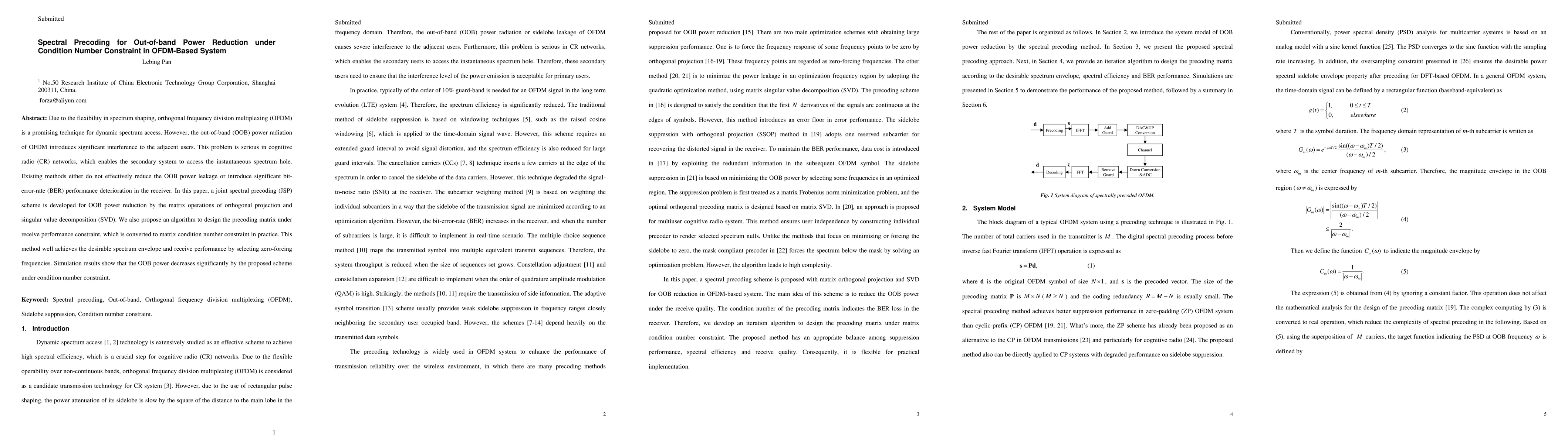 Due to the flexibility in spectrum shaping, orthogonal frequency division multiplexing (OFDM) is a promising technique for dynamic spectrum access. However, the out-of-band (OOB) power radiation of OFDM introduces significant interference to the adjacent users. This problem is serious in cognitive radio (CR) networks, which enables the secondary system to access the instantaneous spectrum hole. Existing methods either do not effectively reduce the OOB power leakage or introduce significant bit-error-rate (BER) performance deterioration in the receiver. In this paper, a joint spectral precoding (JSP) scheme is developed for OOB power reduction by the matrix operations of orthogonal projection and singular value decomposition (SVD). We also propose an algorithm to design the precoding matrix under receive performance constraint, which is converted to matrix condition number constraint in practice. This method well achieves the desirable spectrum envelope and receive performance by selecting zero-forcing frequencies. Simulation results show that the OOB power decreases significantly by the proposed scheme under condition number constraint.
