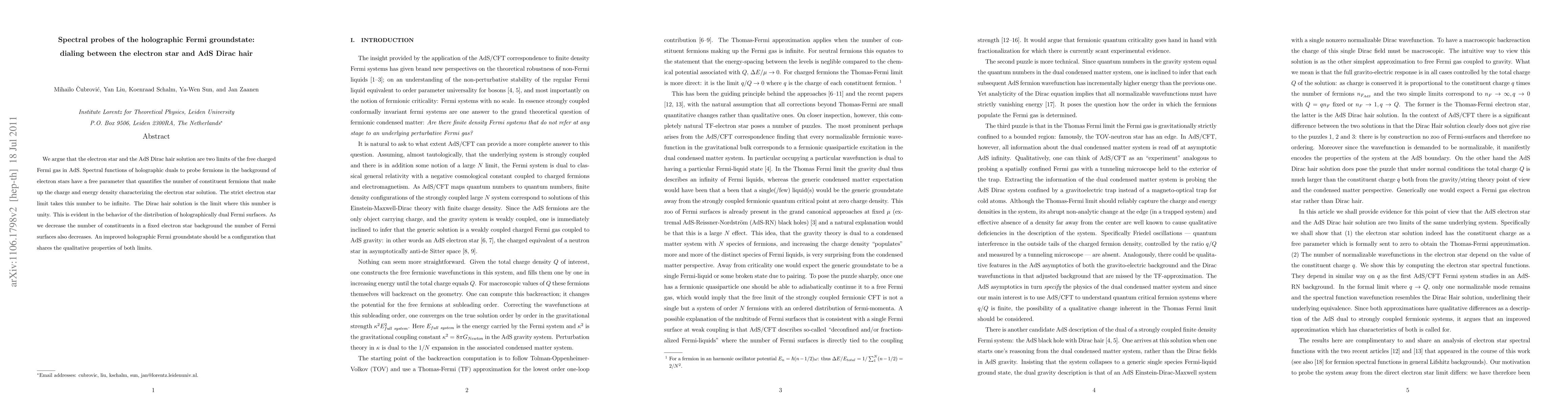 We argue that the electron star and the AdS Dirac hair solution are two limits of the free charged Fermi gas in AdS. Spectral functions of holographic duals to probe fermions in the background of electron stars have a free parameter that quantifies the number of constituent fermions that make up the charge and energy density characterizing the electron star solution. The strict electron star limit takes this number to be infinite. The Dirac hair solution is the limit where this number is unity. This is evident in the behavior of the distribution of holographically dual Fermi surfaces. As we decrease the number of constituents in a fixed electron star background the number of Fermi surfaces also decreases. An improved holographic Fermi groundstate should be a configuration that shares the qualitative properties of both limits.