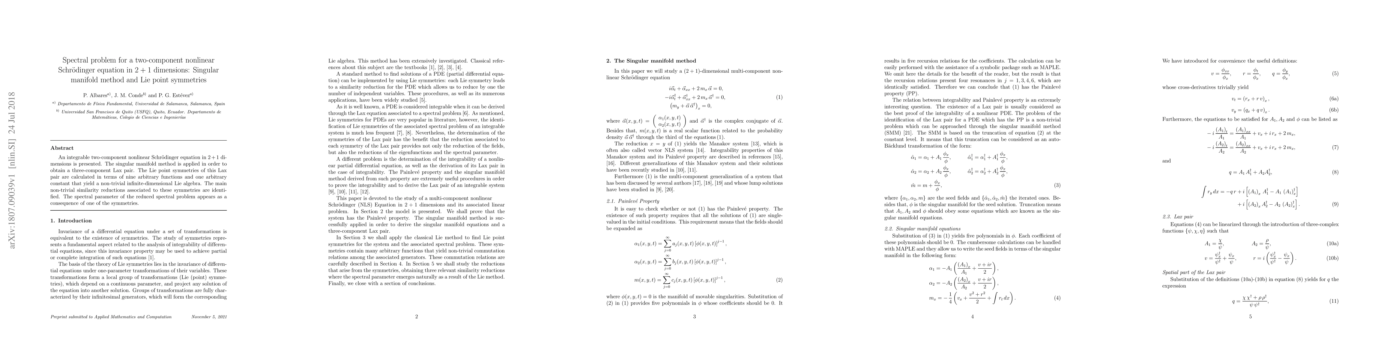 An integrable two-component nonlinear Schr\"odinger equation in $2+1$ dimensions is presented. The singular manifold method is applied in order to obtain a three-component Lax pair. The Lie point symmetries of this Lax pair are calculated in terms of nine arbitrary functions and one arbitrary constant that yield a non-trivial infinite-dimensional Lie algebra. The main non-trivial similarity reductions associated to these symmetries are identified. The spectral parameter of the reduced spectral problem appears as a consequence of one of the symmetries.
