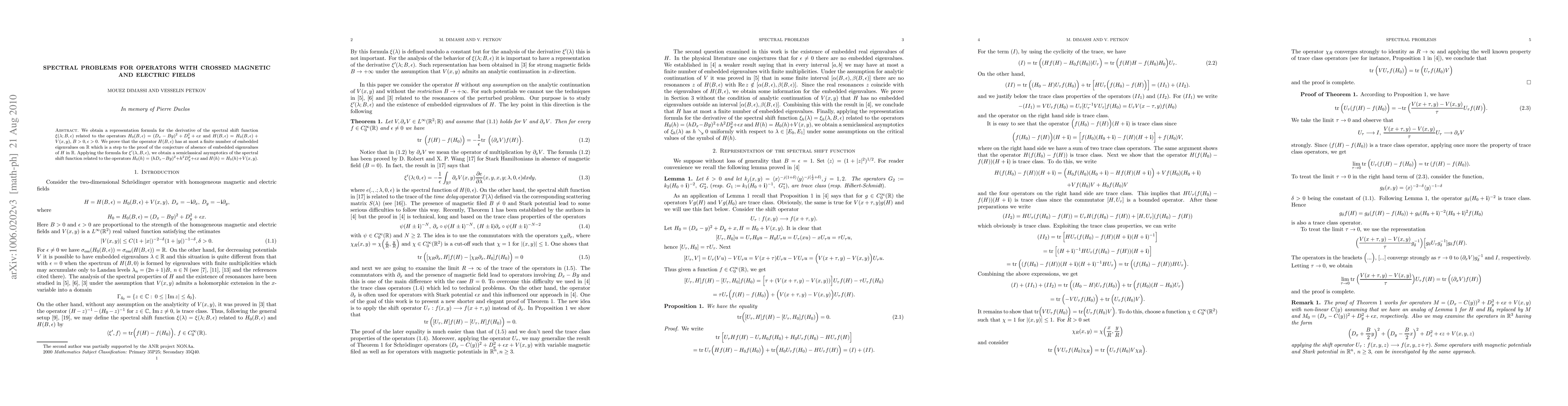 This paper establishes a representation formula for the derivative of the spectral shift function related to operators with crossed magnetic and electric fields, showing that these operators have at most a finite number of embedded eigenvalues on real line.