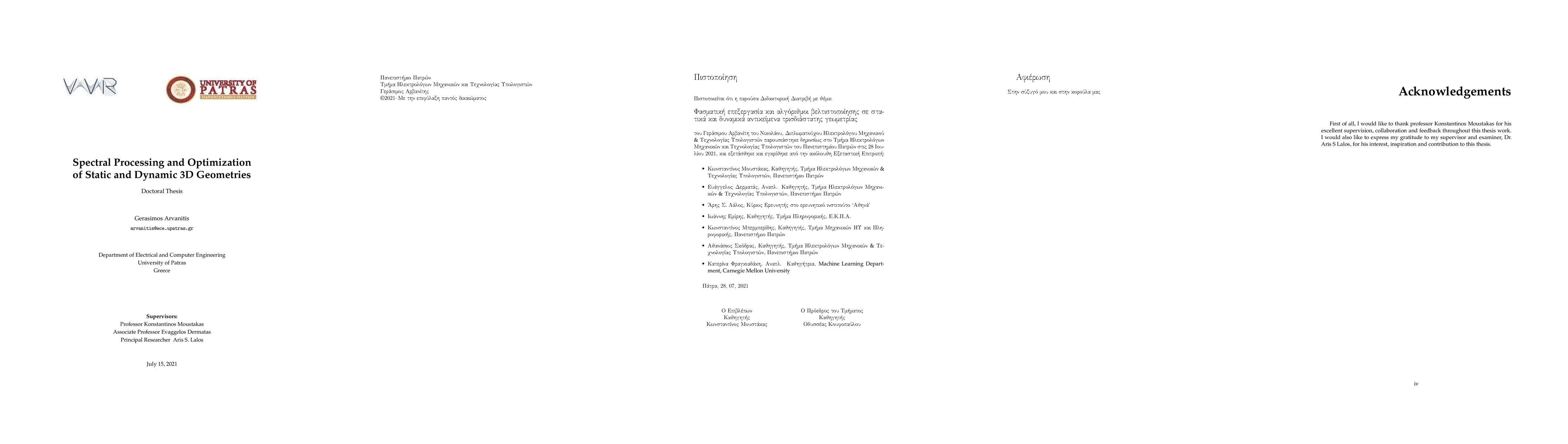 This paper proposes spectral processing and optimization algorithms for efficient 3D geometry processing, including reconstruction, denoising, and feature extraction, to enhance applications like robot navigation and 3D object recognition, addressing the shift from expensive to affordable range sensors. The focus is on reducing manual intervention and improving real-time processing capabilities for both static and dynamic 3D models.