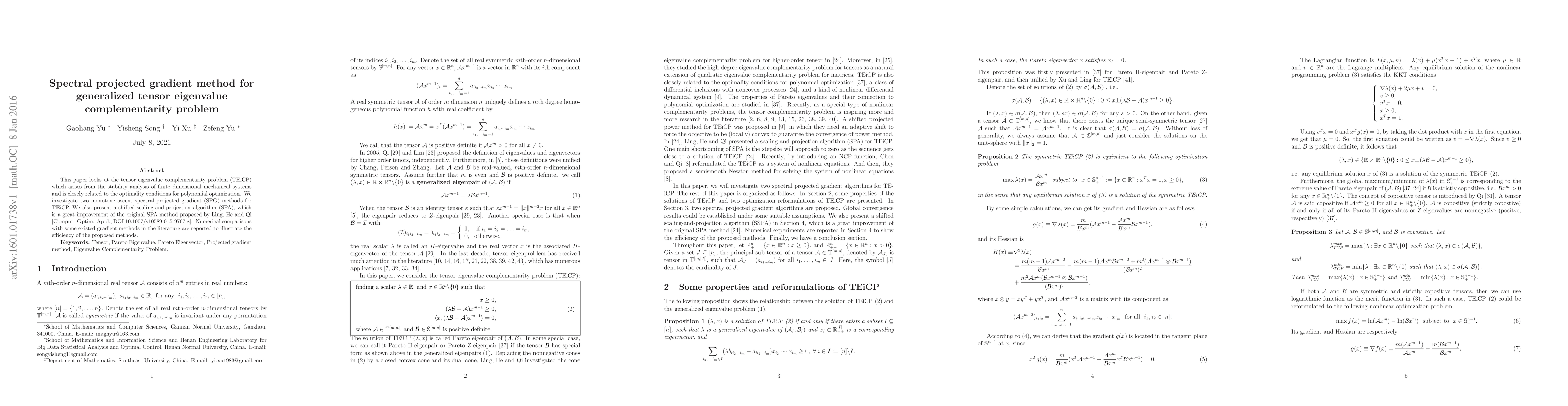 This paper proposes two spectral projected gradient methods for solving the tensor eigenvalue complementarity problem (TEiCP), which is significant in mechanical systems stability analysis and polynomial optimization. It also introduces an improved shifted scaling-and-projection algorithm (SPA), demonstrating its efficiency through numerical comparisons with existing gradient methods.