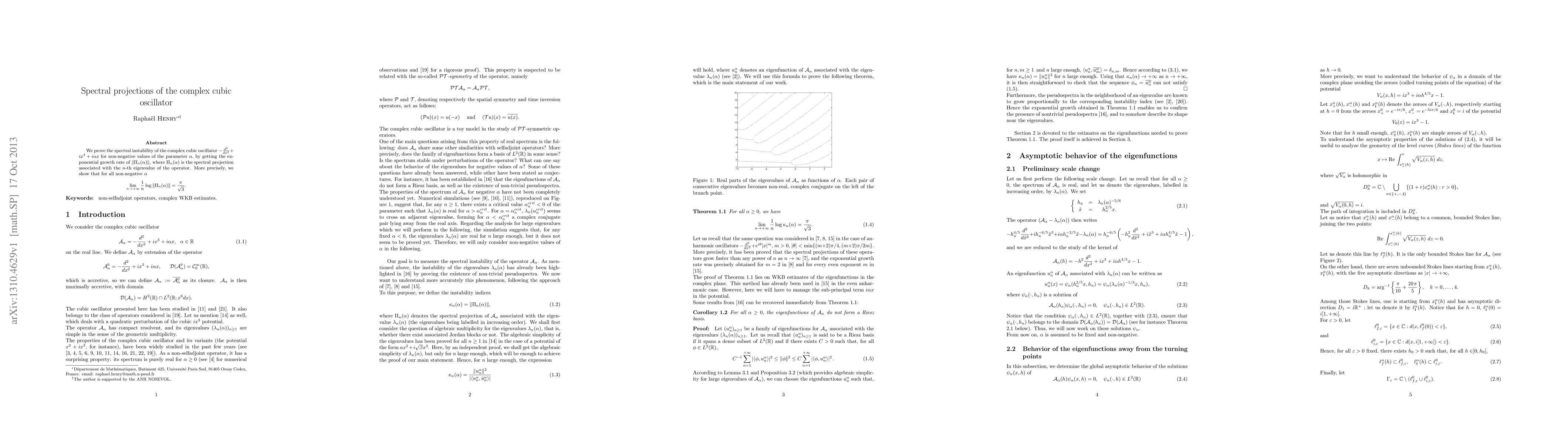 We prove the spectral instability of the complex cubic oscillator $-\frac{d^2}{dx^2}+ix^3+i\alpha x$ for non-negative values of the parameter $\alpha$, by getting the exponential growth rate of $\|\Pi_n(\alpha)\|$, where $\Pi_n(\alpha)$ is the spectral projection associated with the $n$-th eigenvalue of the operator. More precisely, we show that for all non-negative $\alpha$ \[ \lim\limits_{n\to+\infty}\frac{1}{n}\log\|\Pi_n(\alpha)\| = \frac{\pi}{\sqrt{3}}. \]