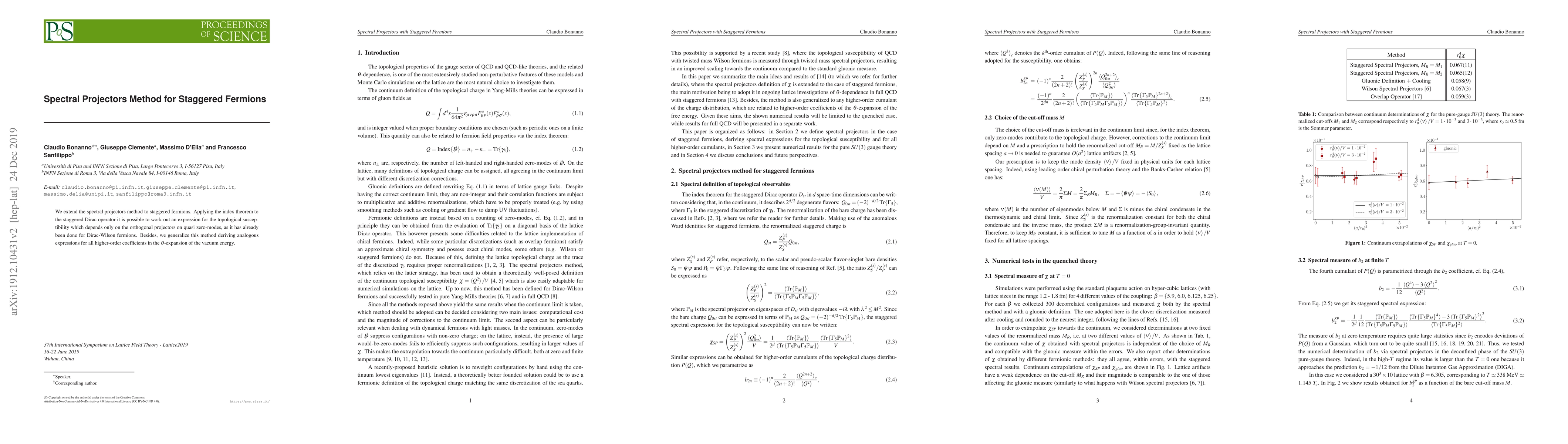 The Spectral Projectors Method is applied to staggered fermions, deriving expressions for topological susceptibility and higher-order $\theta$-expansion coefficients based on orthogonal projectors on quasi zero-modes, similar to Dirac-Wilson fermions.
