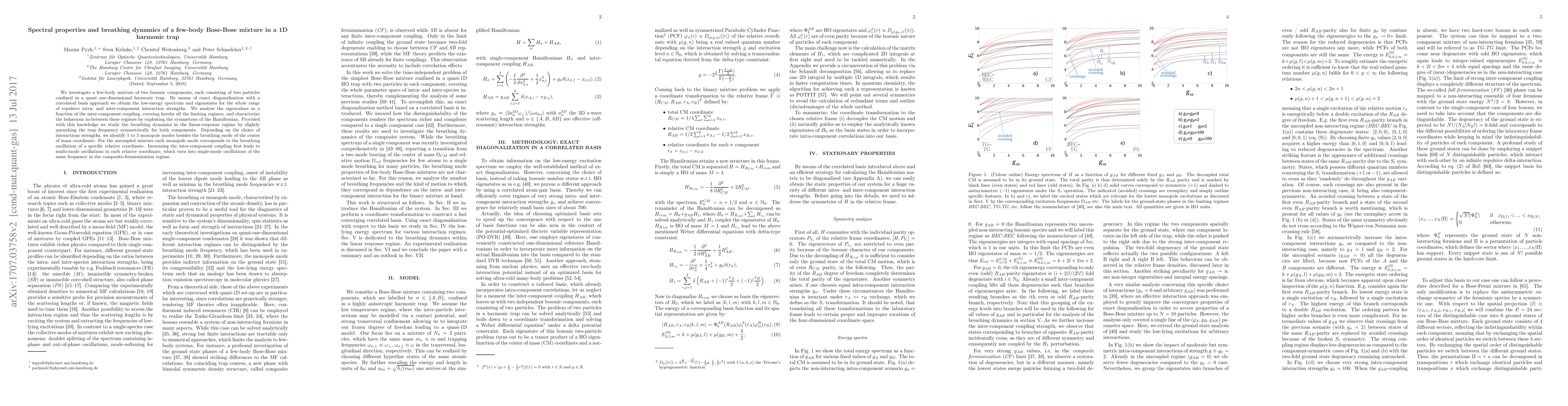 We investigate a few-body mixture of two bosonic components, each consisting of two particles confined in a quasi one-dimensional harmonic trap. By means of exact diagonalization with a correlated basis approach we obtain the low-energy spectrum and eigenstates for the whole range of repulsive intra- and inter-component interaction strengths. We analyse the eigenvalues as a function of the inter-component coupling, covering hereby all the limiting regimes, and characterize the behaviour in-between these regimes by exploiting the symmetries of the Hamiltonian. Provided with this knowledge we study the breathing dynamics in the linear-response regime by slightly quenching the trap frequency symmetrically for both components. Depending on the choice of interactions strengths, we identify 1 to 3 monopole modes besides the breathing mode of the center of mass coordinate. For the uncoupled mixture each monopole mode corresponds to the breathing oscillation of a specific relative coordinate. Increasing the inter-component coupling first leads to multi-mode oscillations in each relative coordinate, which turn into single-mode oscillations of the same frequency in the composite-fermionization regime.
